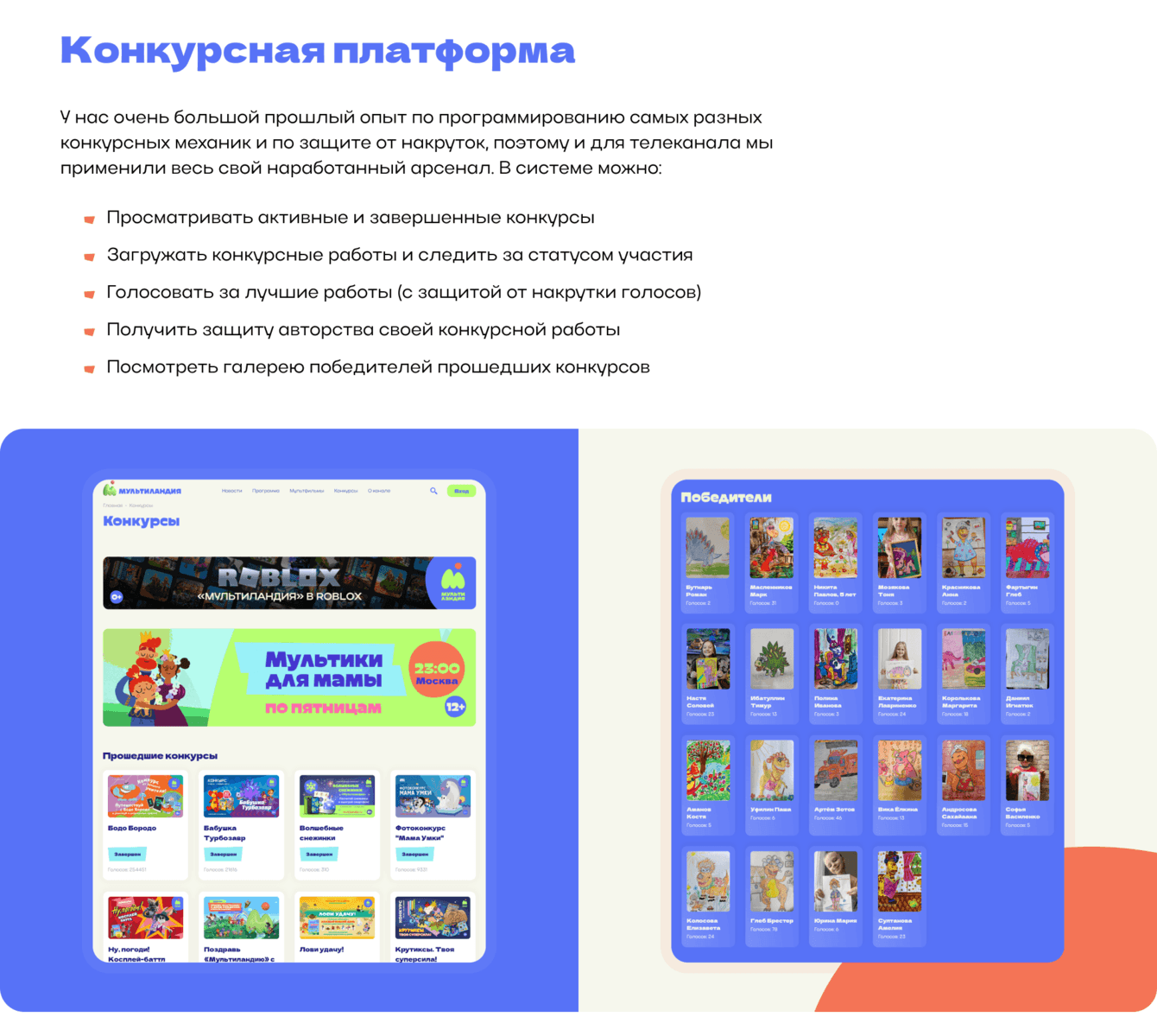 Мы создали не просто сайт, а уютное виртуальное пространство, интересное и понятное как детям, так и их родителям. Одной из главных особенностей стал встроенный конкурсный функционал — мощный интерактивный инструмент для вовлечения пользователей и поддержания связи с брендом.