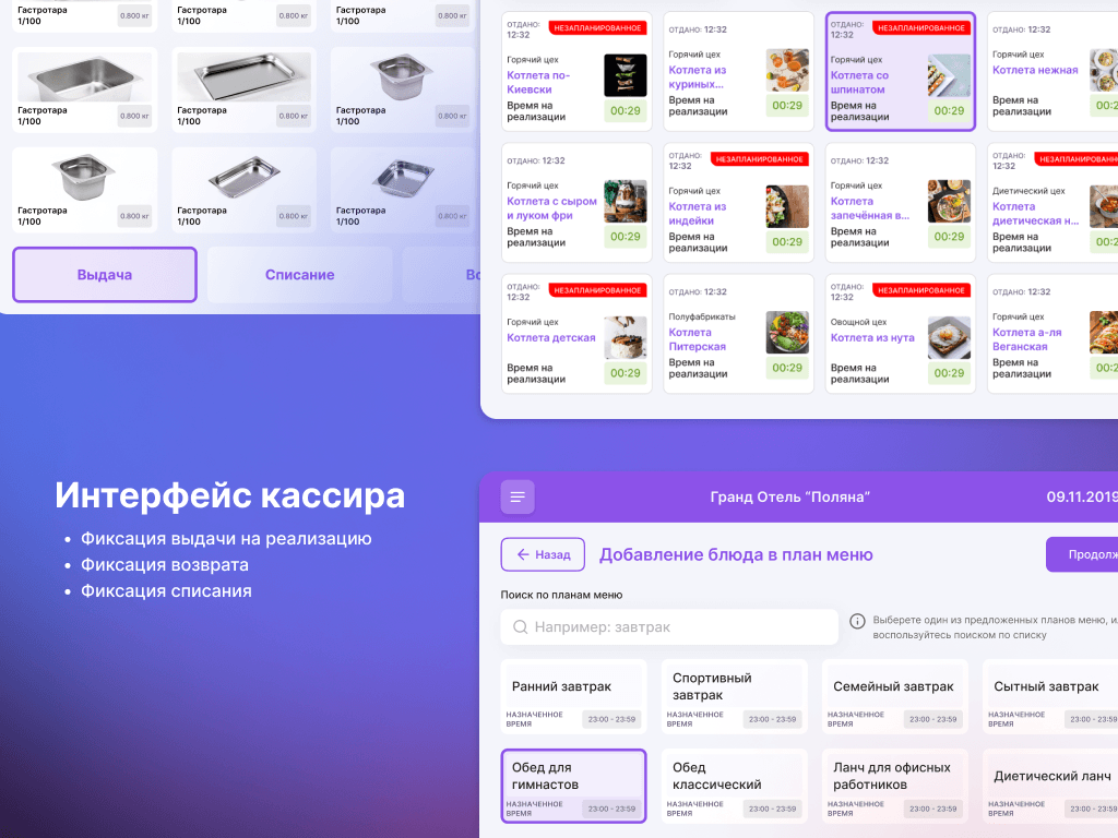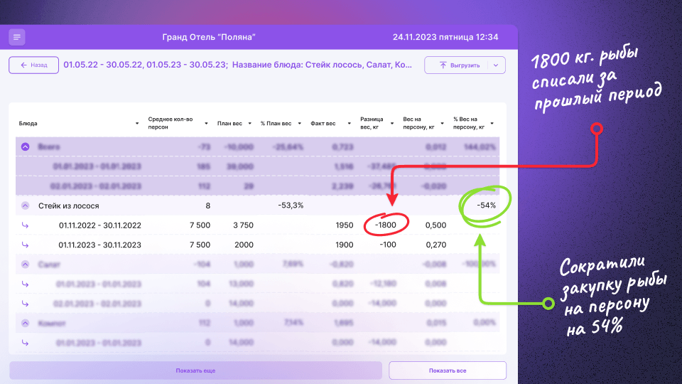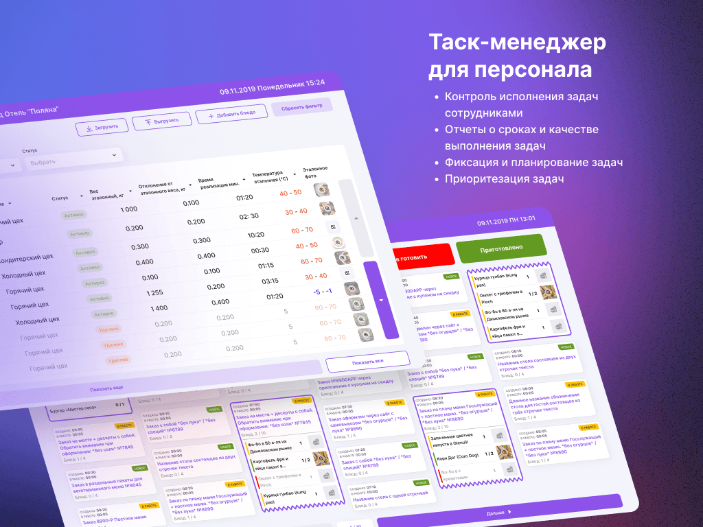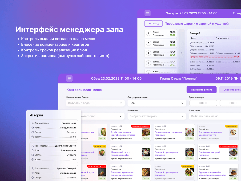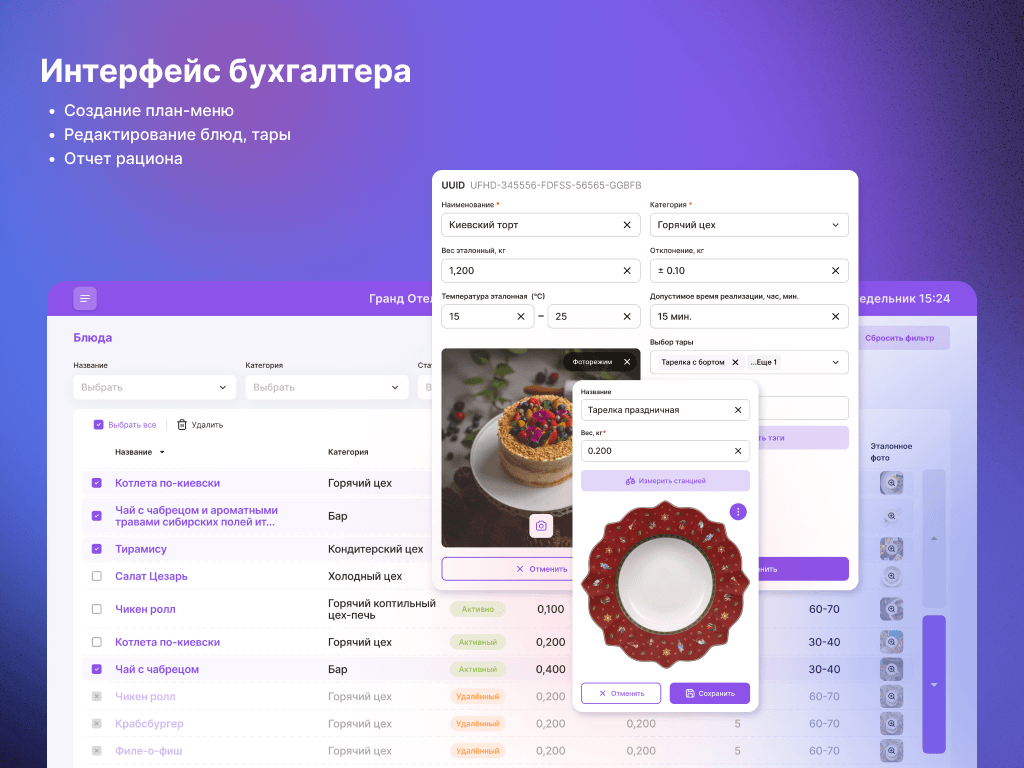 - Программной, которая будет собирать данные, контролировать соответствие блюд нормам и показывать план/факт по каждому продукту.