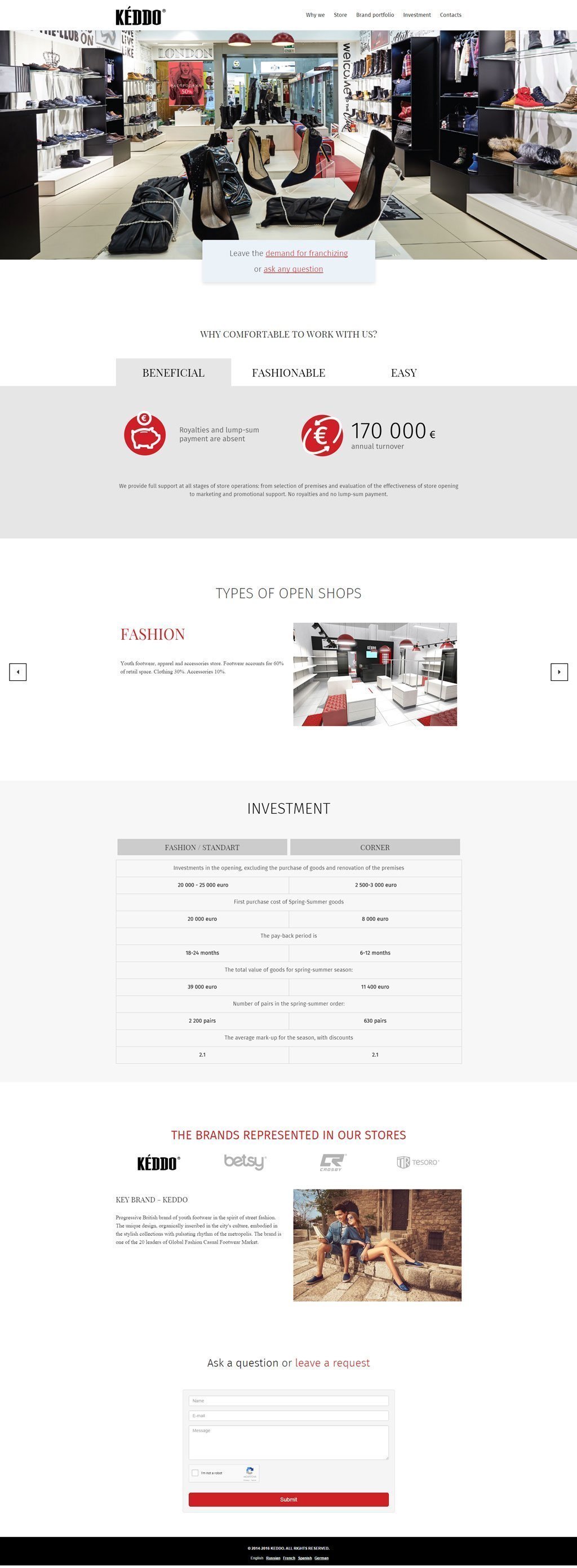 Разработать мультиязычный одностраничный сайт по франчайзингу для бренда KEDDO, также должна быть предусмотрена возможность дальнейшего совершенствования сайта (каталог и новости).