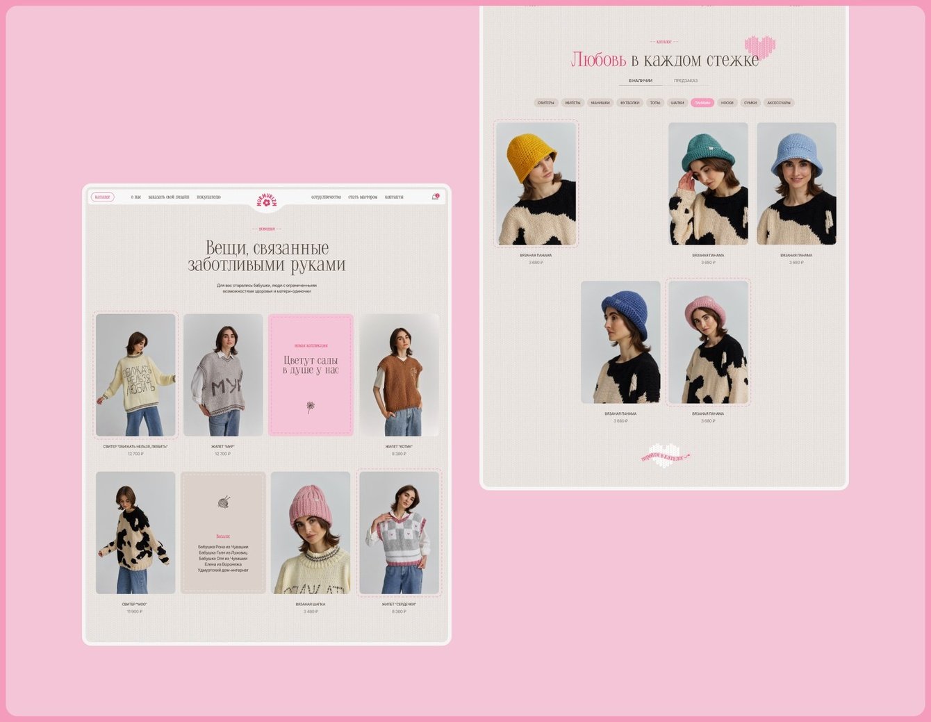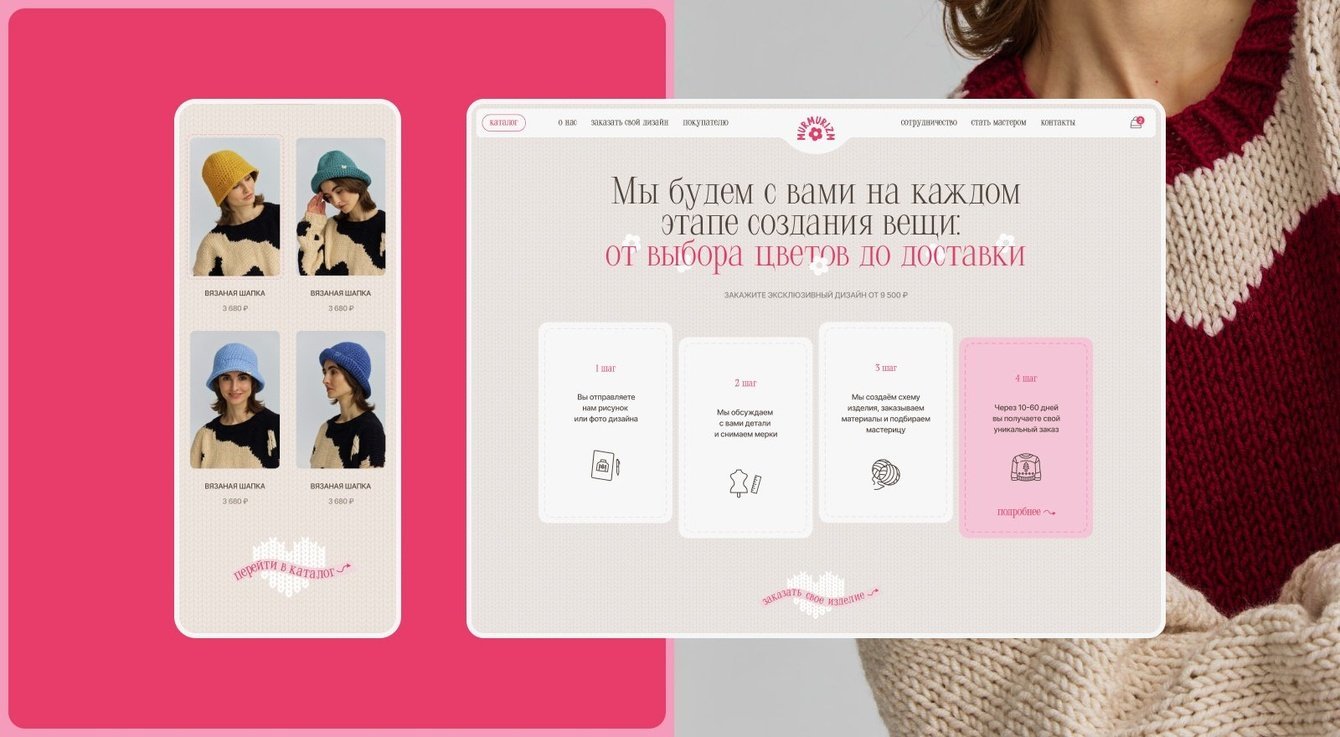 Душевную метафору мы усилили благодаря интересному дизайн-решению: весь сайт собрали на подложке с вязаным принтом, на которую стежками «нашили» элементы и фотографии. При этом разбавили мимимишностью дизайна контрастным акцидентным шрифтом с кинжальными засечками, намекая, что в каждом изделии есть перчинка и стиль.