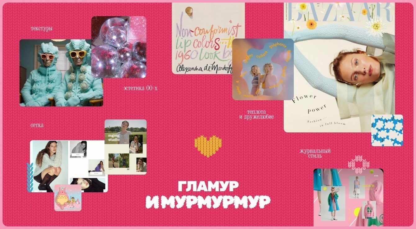 Из экстравагантной части мудборда с фотографиями селебрити и эстетикой 2000-х мы сохранили журнальную сетку и интересную типографику, яркие цвета, фокус на фотографиях, коллажах и многослойности.