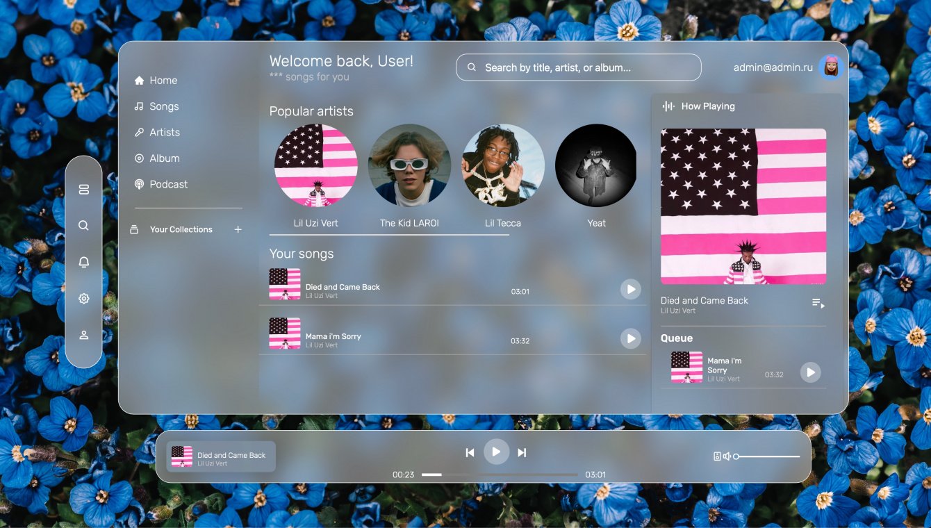 У клиента была задача разработать музыкальное приложение для дипломной работы в колледже / университете. Клиенту нужно было разработать свой собственный плеер + добавлять треки себе в плейлист и чтобы admin мог создавать треки альбомы и авторов