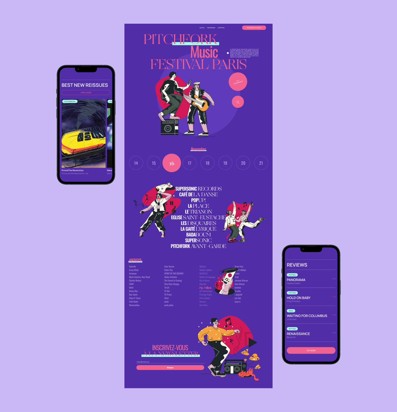При создании дизайна мы сосредоточились на создании яркого и динамичного визуального стиля, который отражает энергию и страсть, присущие музыке. Основной акцент был сделан на цветовой гамме, которая сочетает насыщенные и выразительные оттенки, создающие эмоциональную связь с аудиторией. Мы использовали яркую цветовую гамму, в которой доминируют фиолетовый и розовый цвета. Фиолетовый был выбран как основной акцент, символизирующий креативность и глубину, а розовый добавляет энергии и эмоциональности. Такое сочетание создает современный, стильный и динамичный облик, который привлекает внимание и усиливает впечатление от взаимодействия с сайтом.