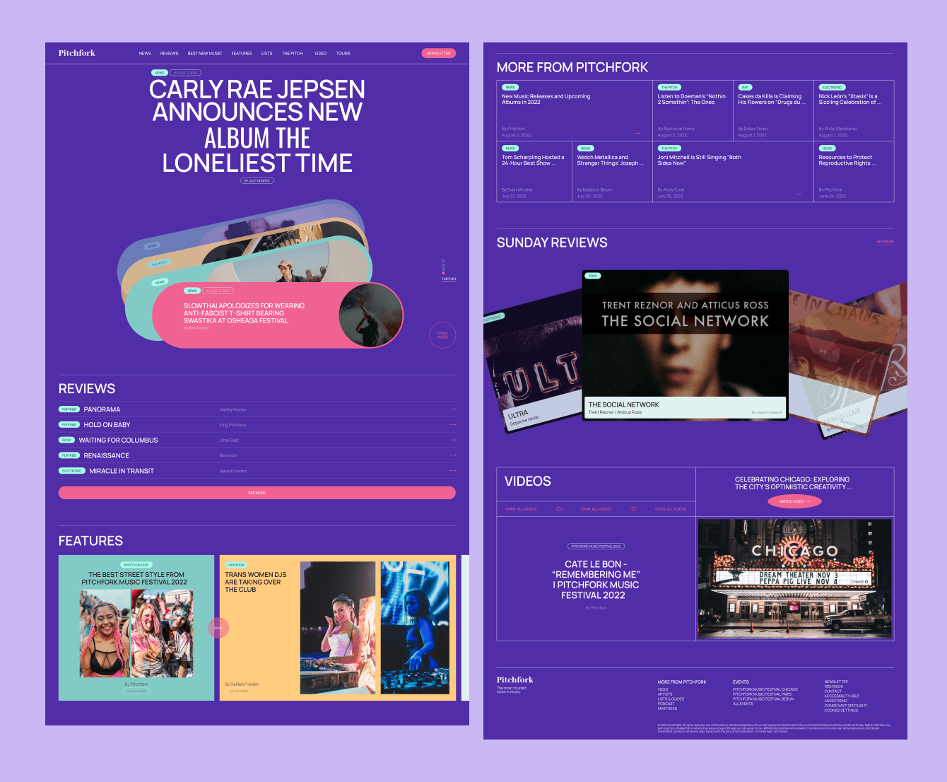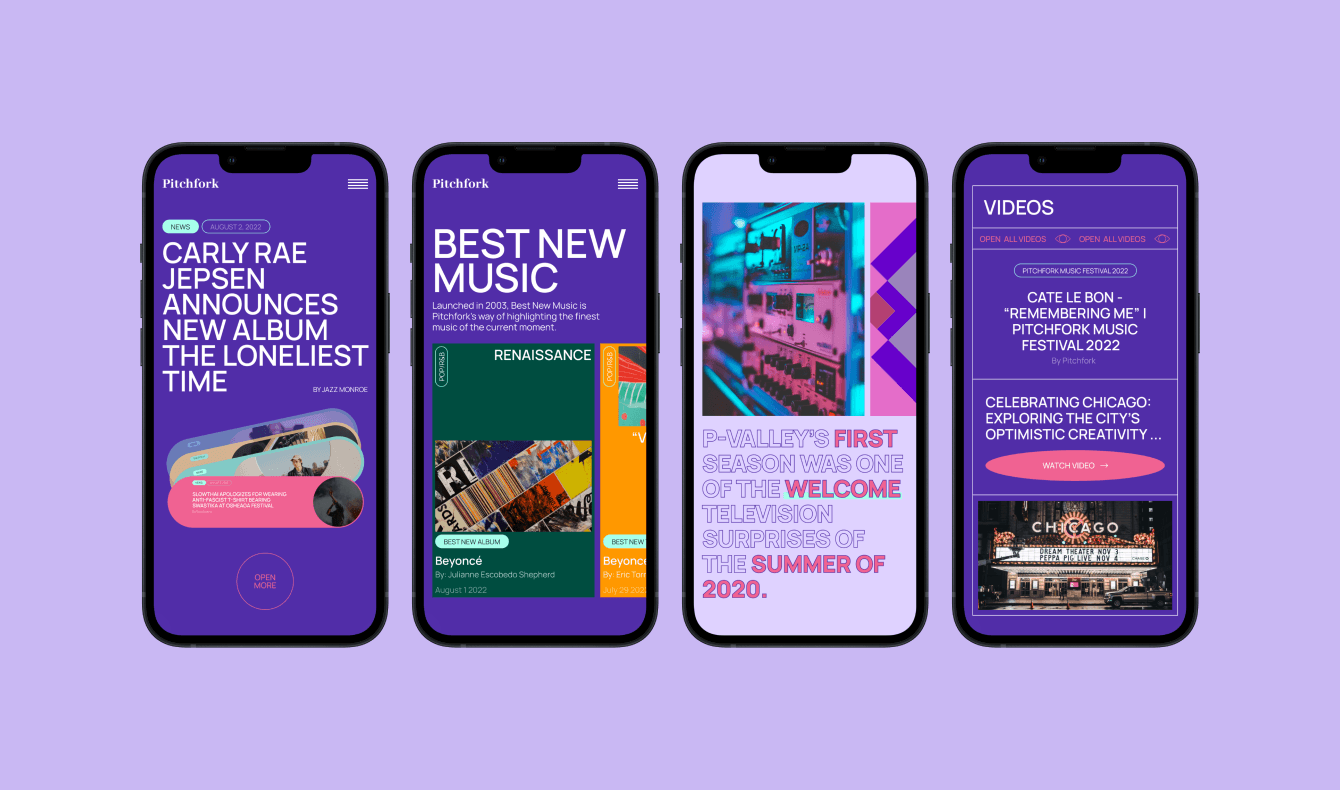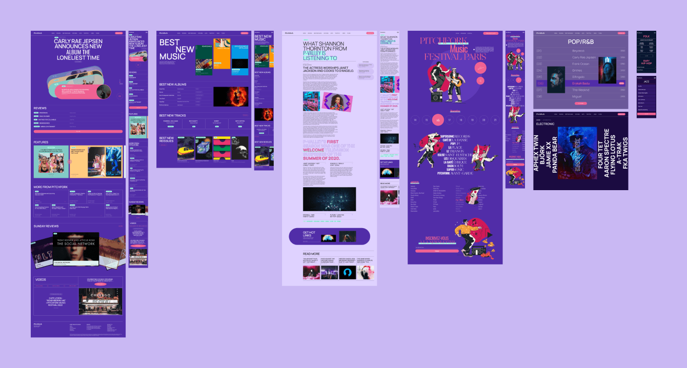 Перед нами стояла задача сделать полный редизайн музыкального интернет-журнала Pitchfork. Внести значительные изменения в стиль и цветовую гамму сайта. Придать яркий и привлекательный облик, чтобы отразить энергию и страсть, связанные с музыкой.