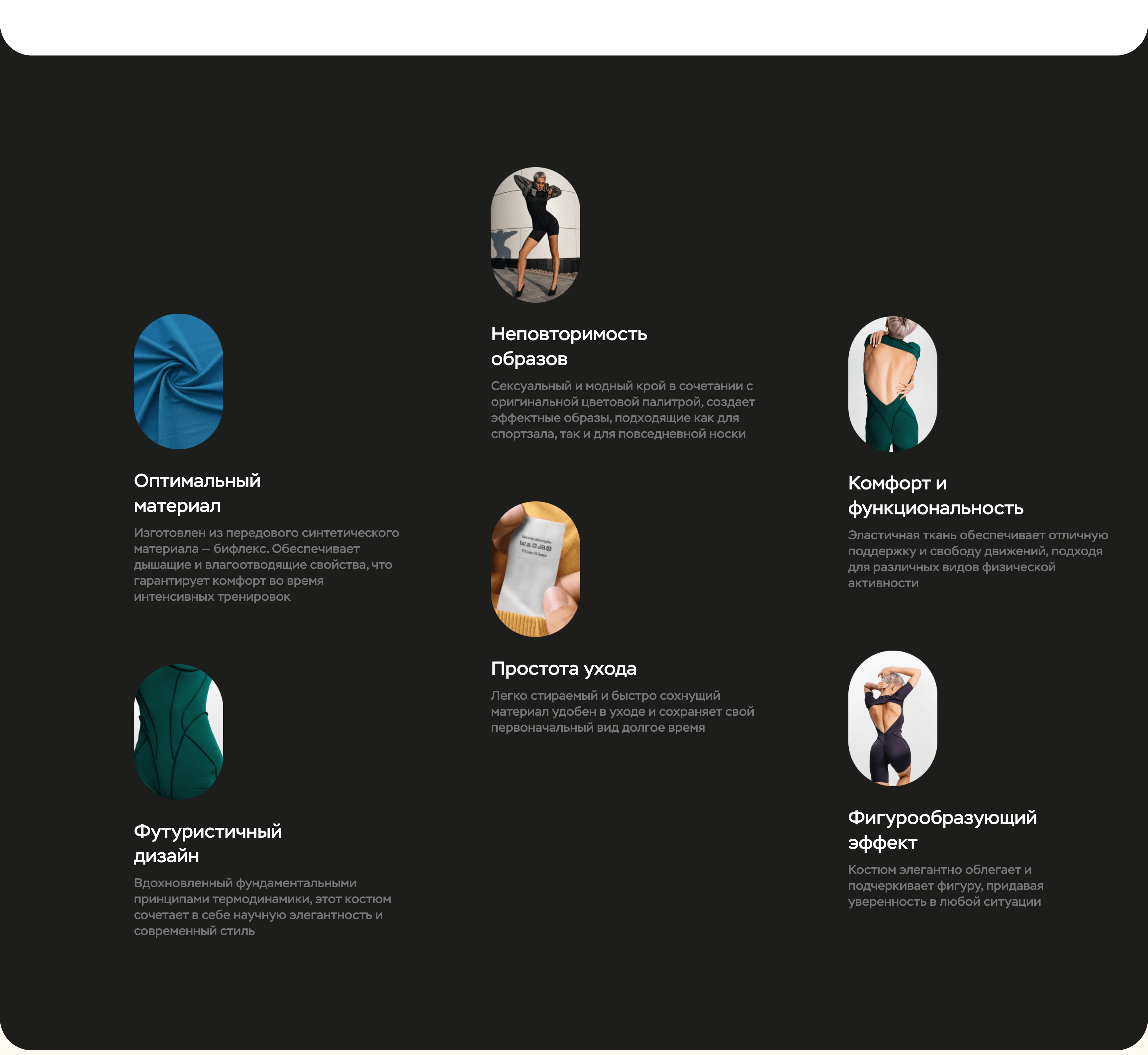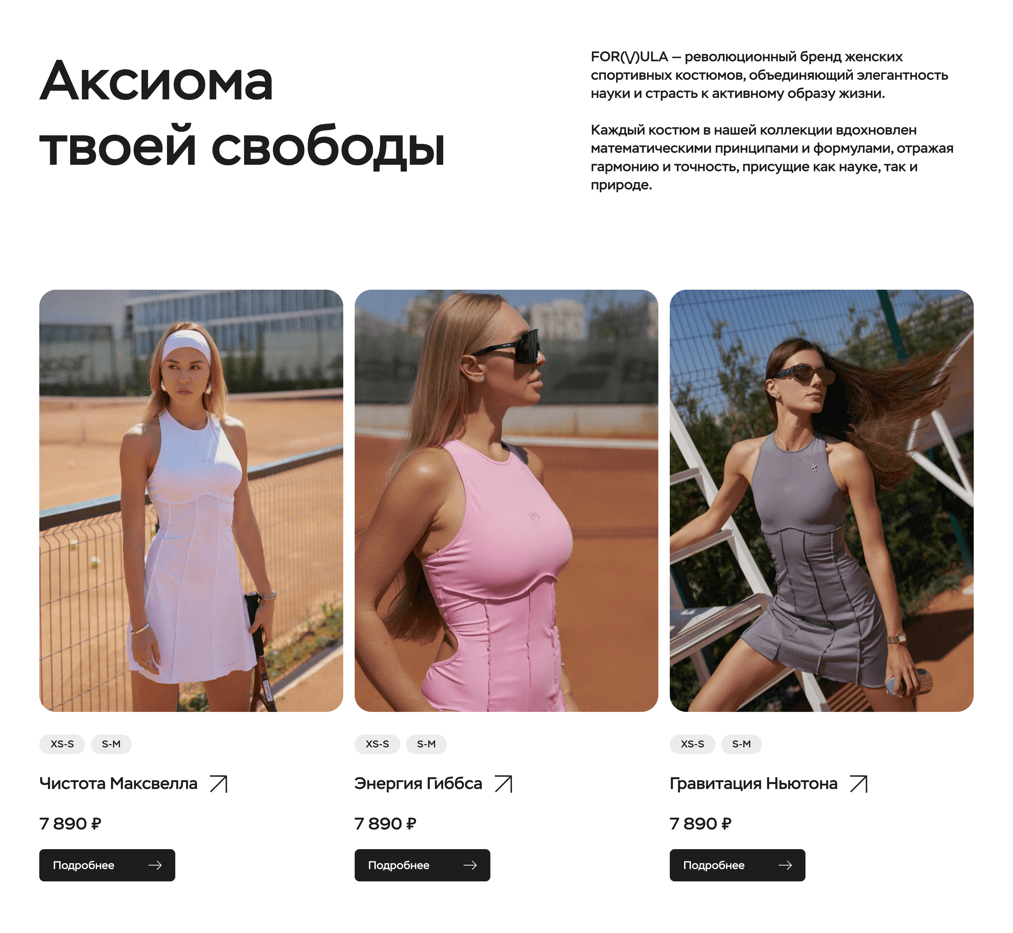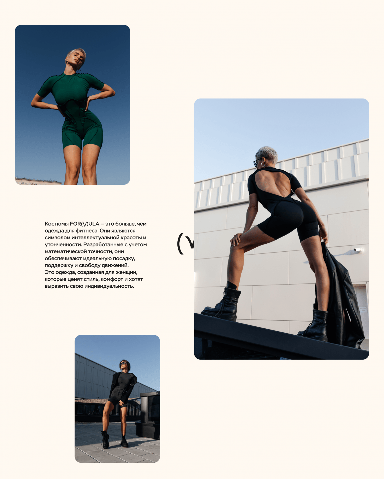 FOR(\/)ULA — революционный бренд женских спортивных костюмов, объединяющий элегантность науки и страсть к активному образу жизни. Каждый костюм в нашей коллекции вдохновлен математическими принципами и формулами, отражая гармонию и точность, присущие как науке, так и природе.