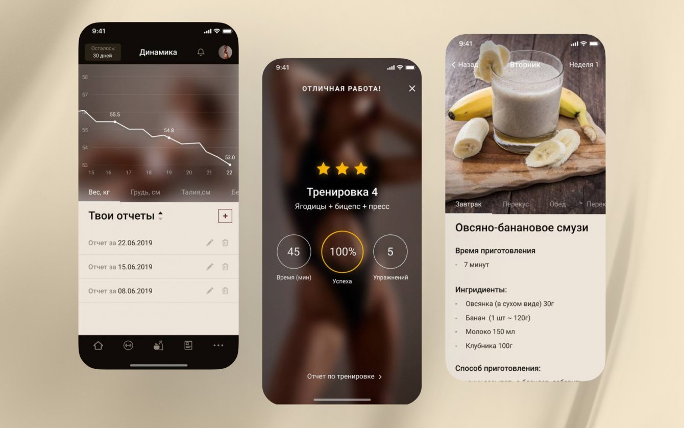 Рацион формируется исходя из параметров пользователя и уровня физической активности. В разделе “Питание” можно указать вкусовые предпочтения, а также желаемый вес. Все это будет учитываться при формировании рациона на месяц. К каждому приему пищи прилагается рецепт приготовления блюда, ингредиенты, а также данные по КБЖУ. В разделе “Продуктовая корзина” автоматически формируется список продуктов на неделю, с которым можно идти в магазин. А для тех, кто питается по собственному меню и самостоятельно считает калории, осуществили интеграцию с Fatsecret.
