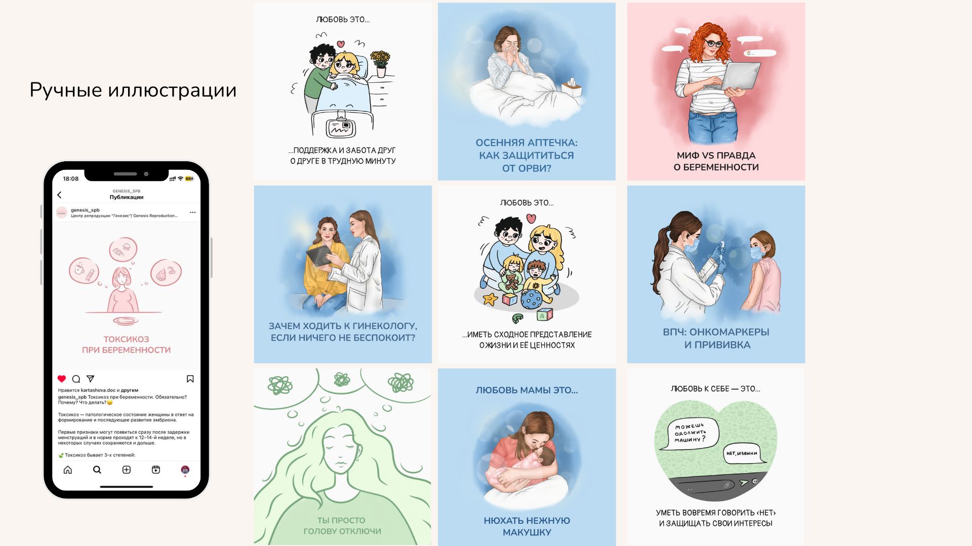 После анализа конкурентов мы поняли, что рисунки идеально подходят для объяснения сложных процессов (как работает ЭКО, что такое гормоны). И помогает отличиться от шаблонного подхода конкурентов на рынке.