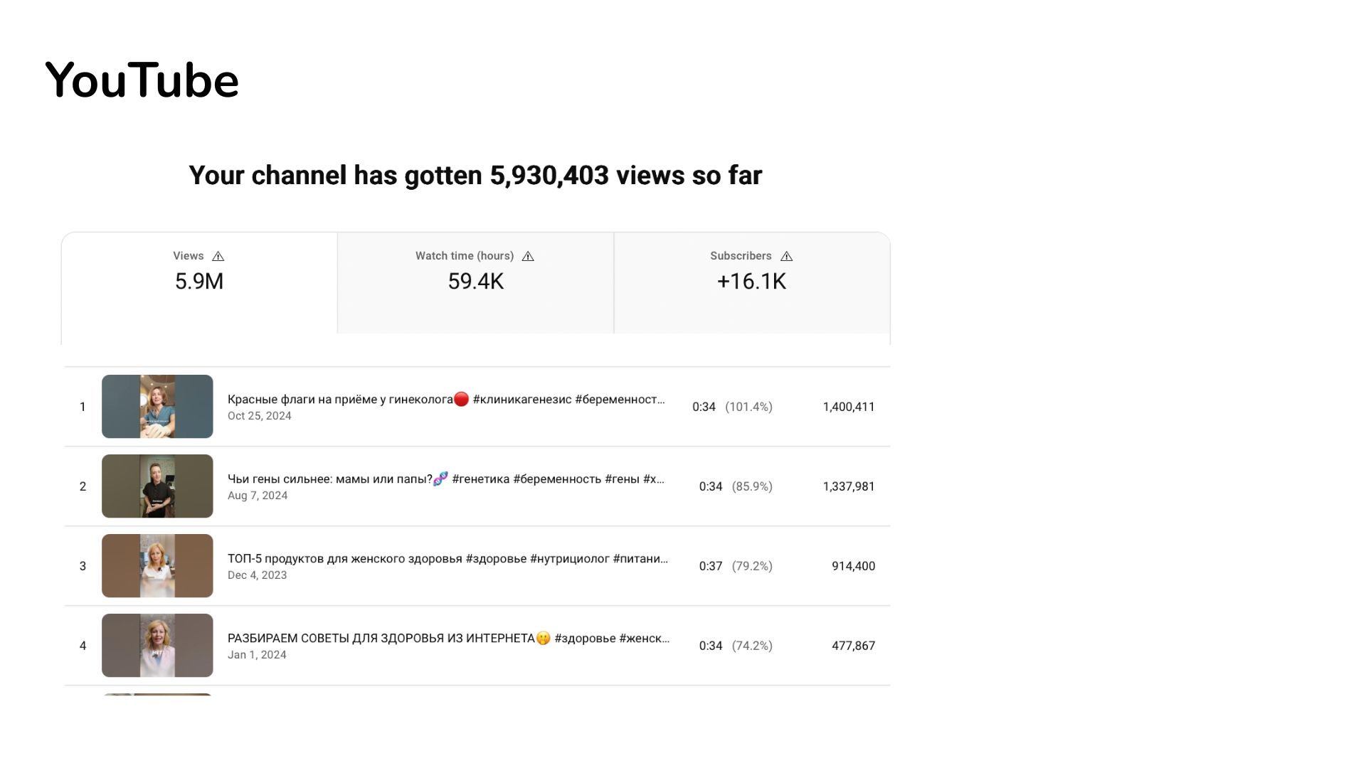 YouTube: 5,9 млн просмотров и 16 000+ подписчиков.