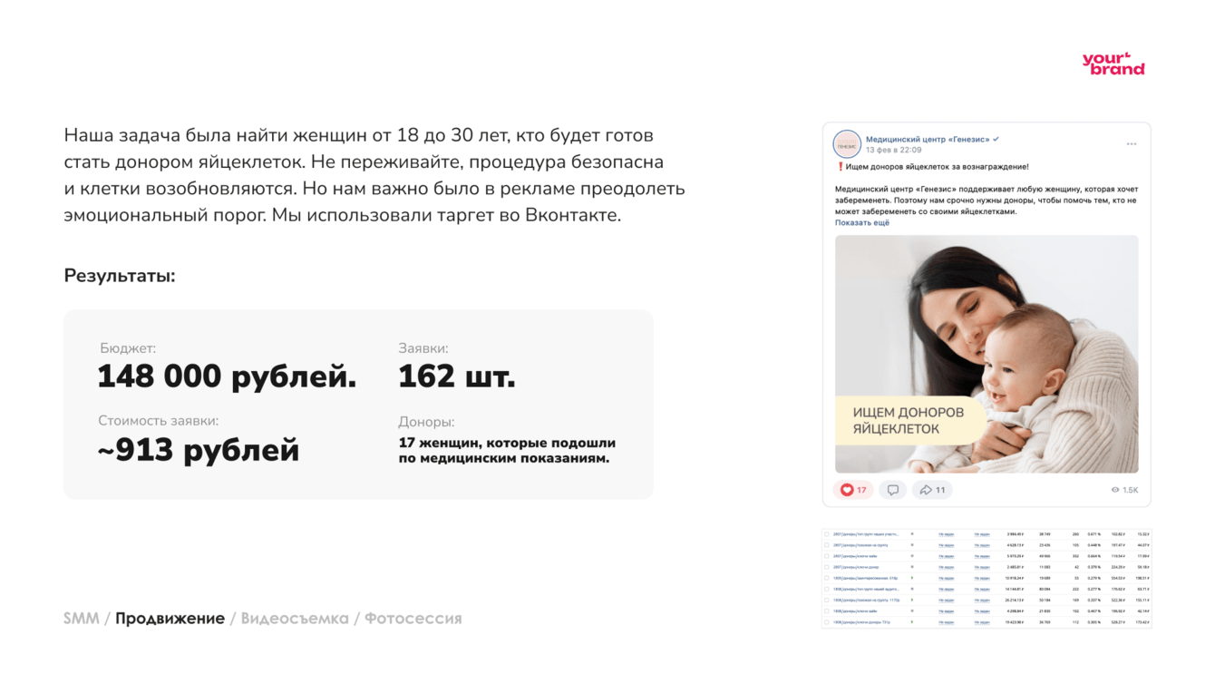 Клиент поставил перед нами нестандартную и крайне чувствительную задачу: найти женщин, готовых стать донорами ооцитов (яйцеклеток). Мы выстроили коммуникацию максимально деликатно, уважительно и информативно, чтобы преодолеть огромный эмоциональный порог.