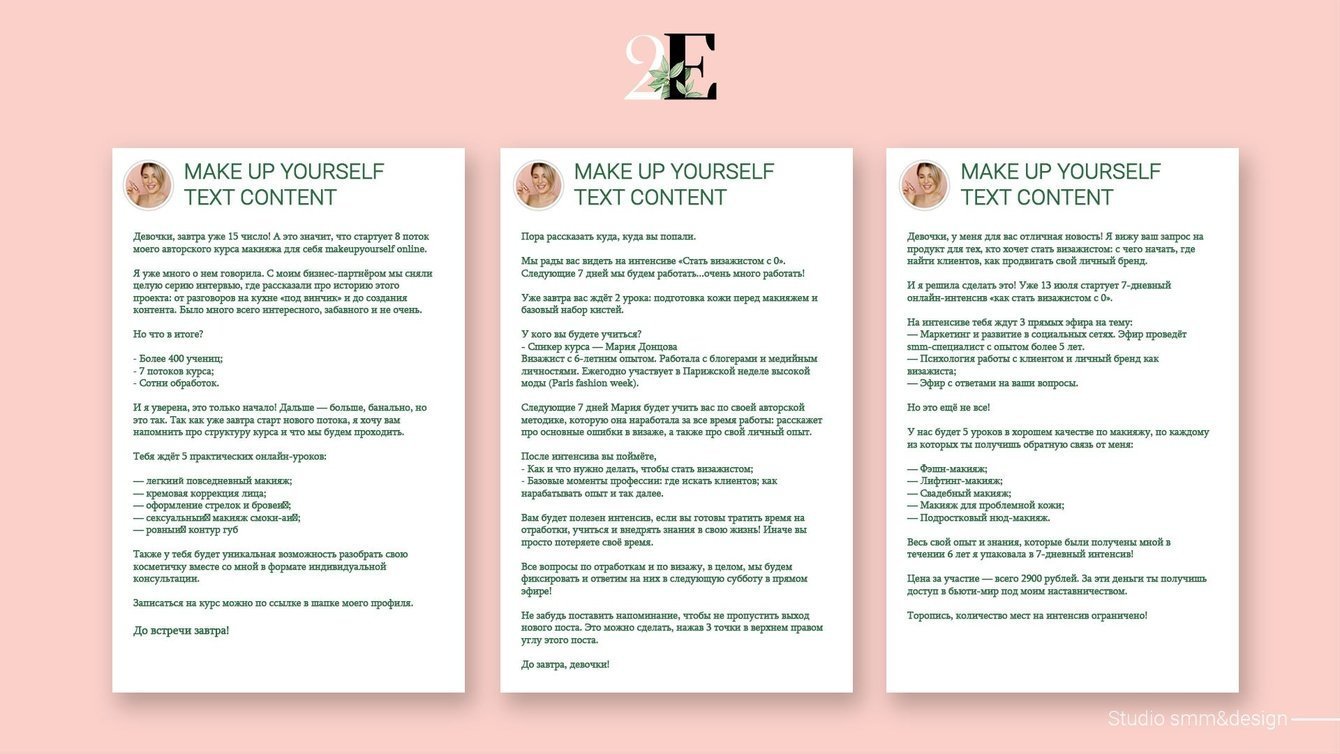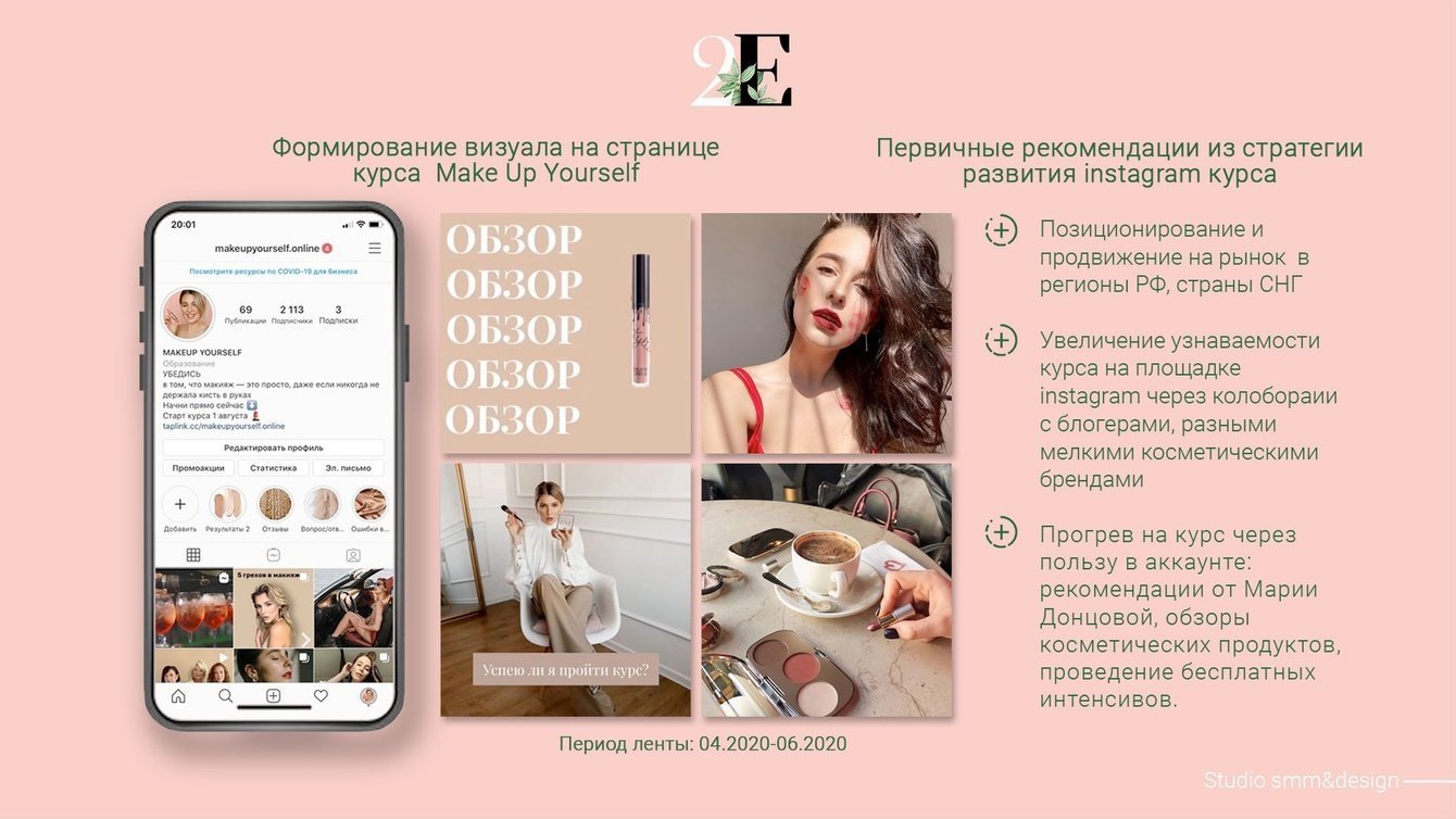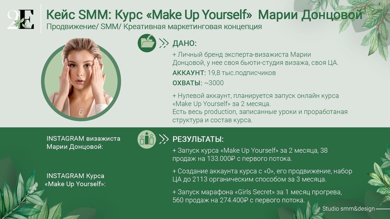 Основная задача: Запуск онлайн-курса "Make Up Yourself", продвижение личного бренда, ведение соц.сетей курса и студии под ключ, разработка SMM и PR-стратегий, работа с блоггерами и лидерами мнений.