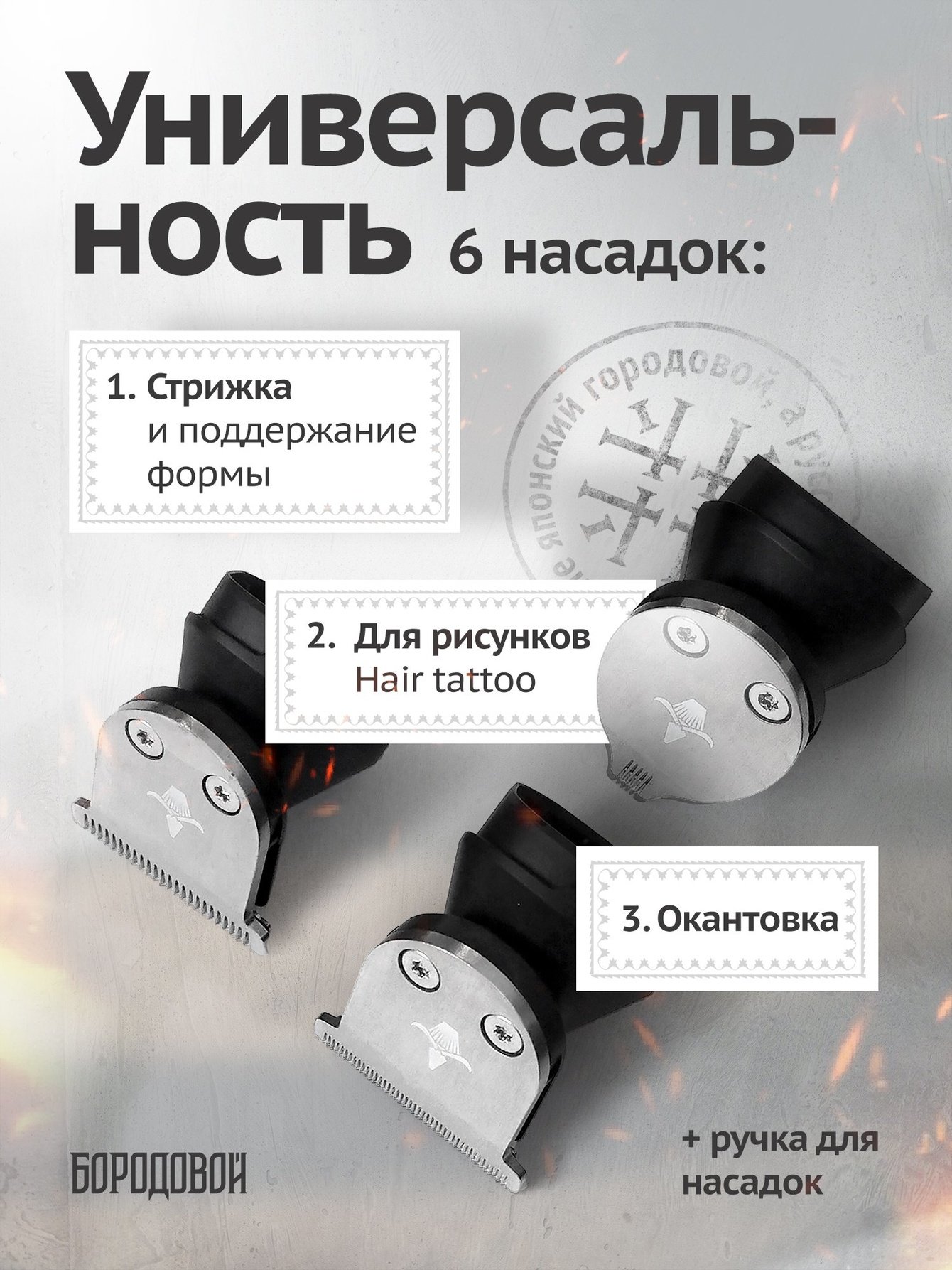 Набор триммера предусматривает инструмент и насадки для него. На самом триммере расположен текстовый логотип белого цвета. На насадках расположен фирменный знак бренда. Логотип на корпус триммера наносится УФ-печатью, фирменный знак на лезвия наносится при помощи гравировки.