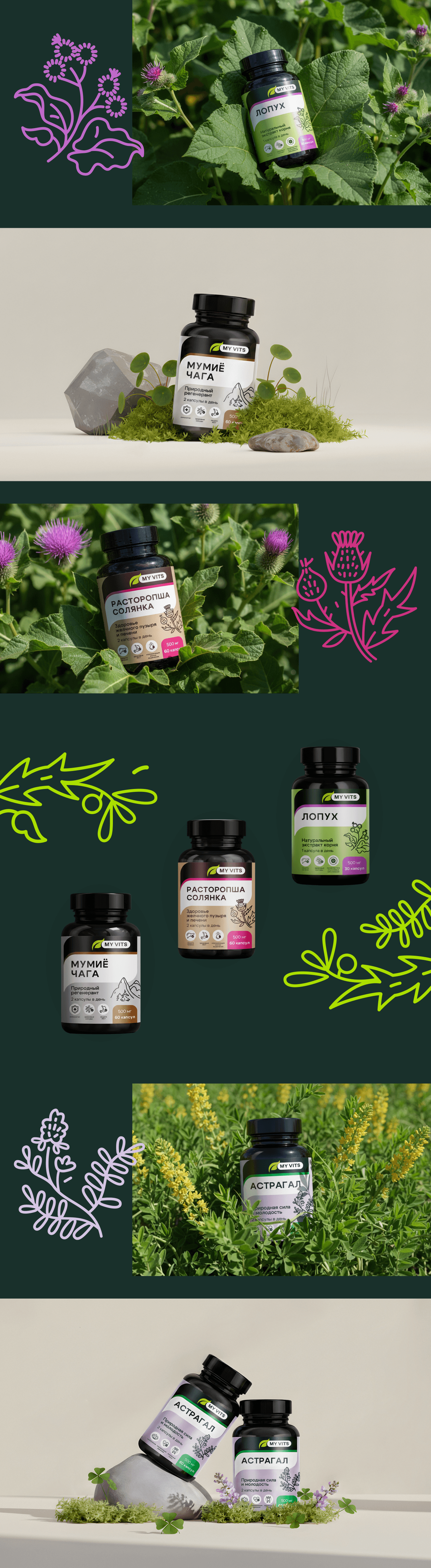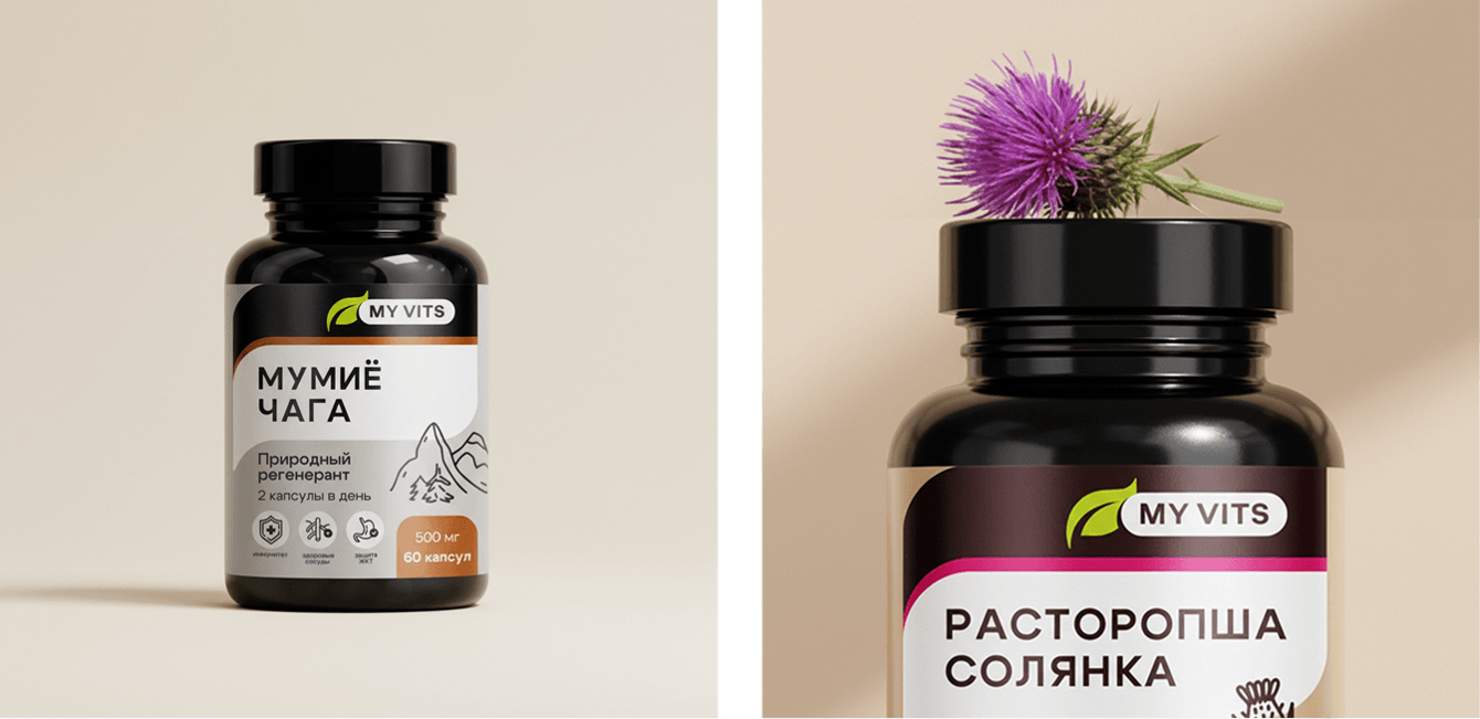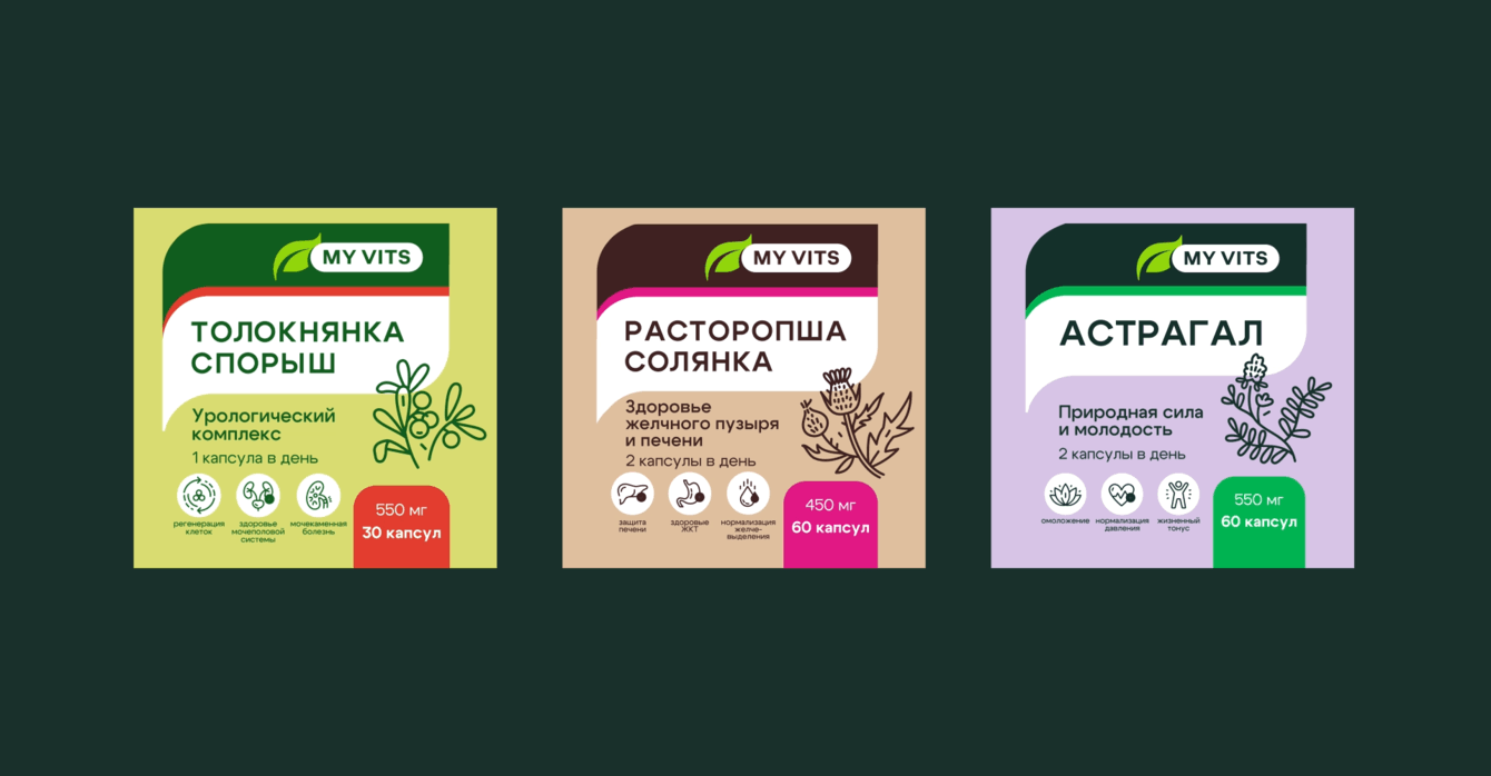 Бренд My Vits получил цельную упаковочную систему, которая выглядит современно и аккуратно, но при этом остаётся понятной и вызывающей доверие для своей аудитории. Линейка читается быстро, распознаётся без ошибок и готова к масштабированию: новые продукты можно добавлять без переизобретения дизайна, а команда клиента получила понятные правила и удобный инструмент для ежедневной работы.