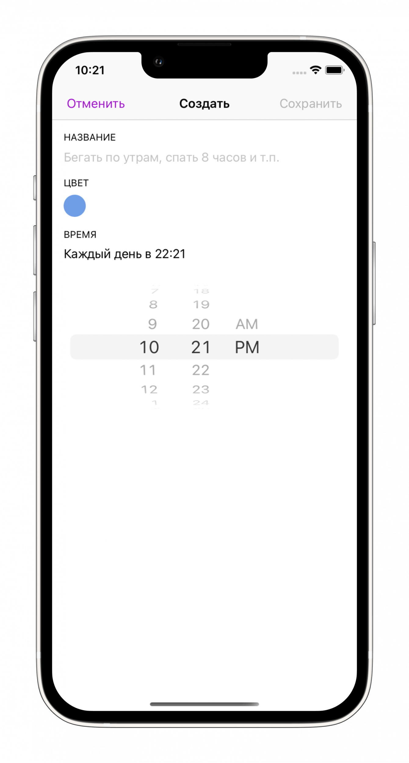 Требовалось создать приложение, которое позволяет пользователям создавать и отслеживать свои привычки. Приложение должно позволять пользователям создавать новые привычки, указывать название, цвет и время выполнения каждой привычки.