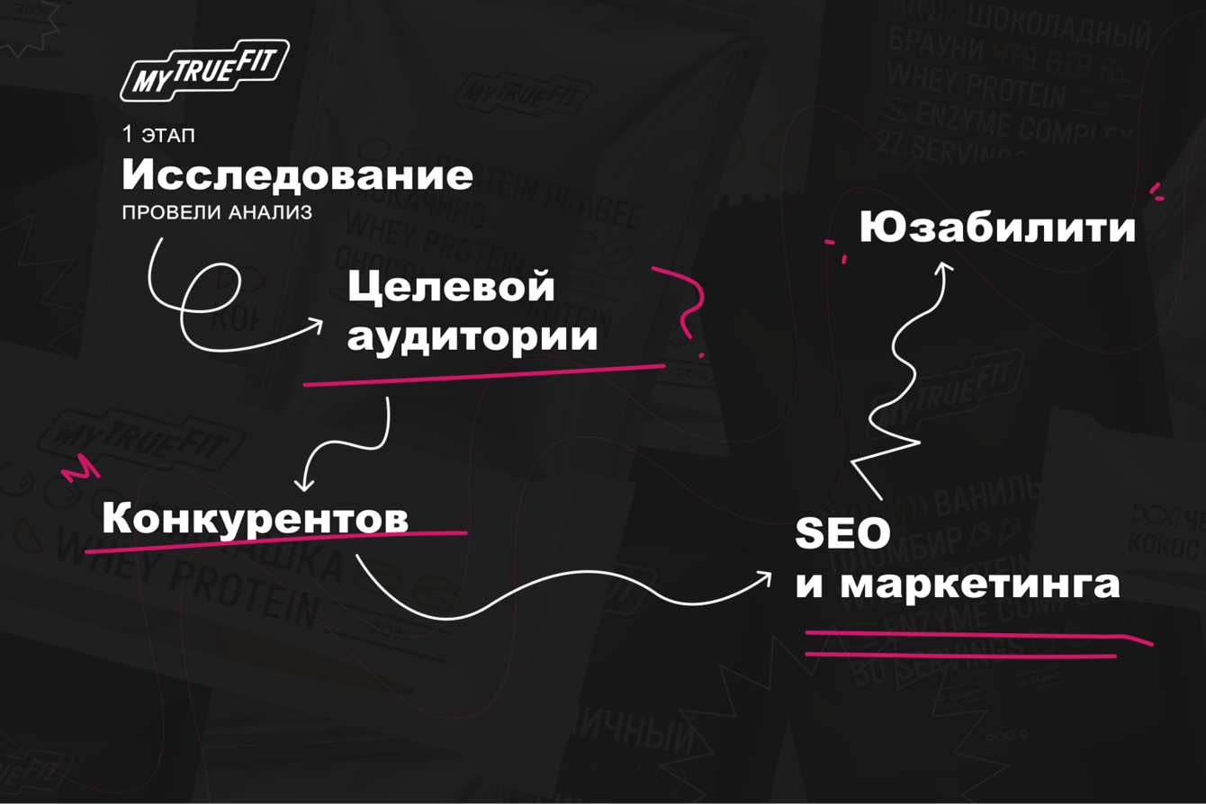 Наш постоянный партнёр — группа компаний «Сибирский Кедр» — обратилась к нам с очередным проектом в рамках договора комплексного обслуживания и развития. Требовалось разработать новый интернет-магазин для выводимого на рынок бренда спортивного питания «MyTrueFit». Клиент запросил создание более динамичного и современного проекта с акцентом на молодёжную аудиторию. Одним из ключевых условий стало стремление уйти от «однотипности» и «минималистичной серости» интернет-магазинов, представленных на рынке. Заказчик особо подчеркнул необходимость отхода от шаблонных решений и предоставил нам практически полную свободу творчества в рамках дизайн-концепции. Основная цель проекта была сформулирована как «создание устойчивого позитивного восприятия бренда через эффективную презентацию продукта и обеспечение возможности масштабирования без радикальной переработки концепции».