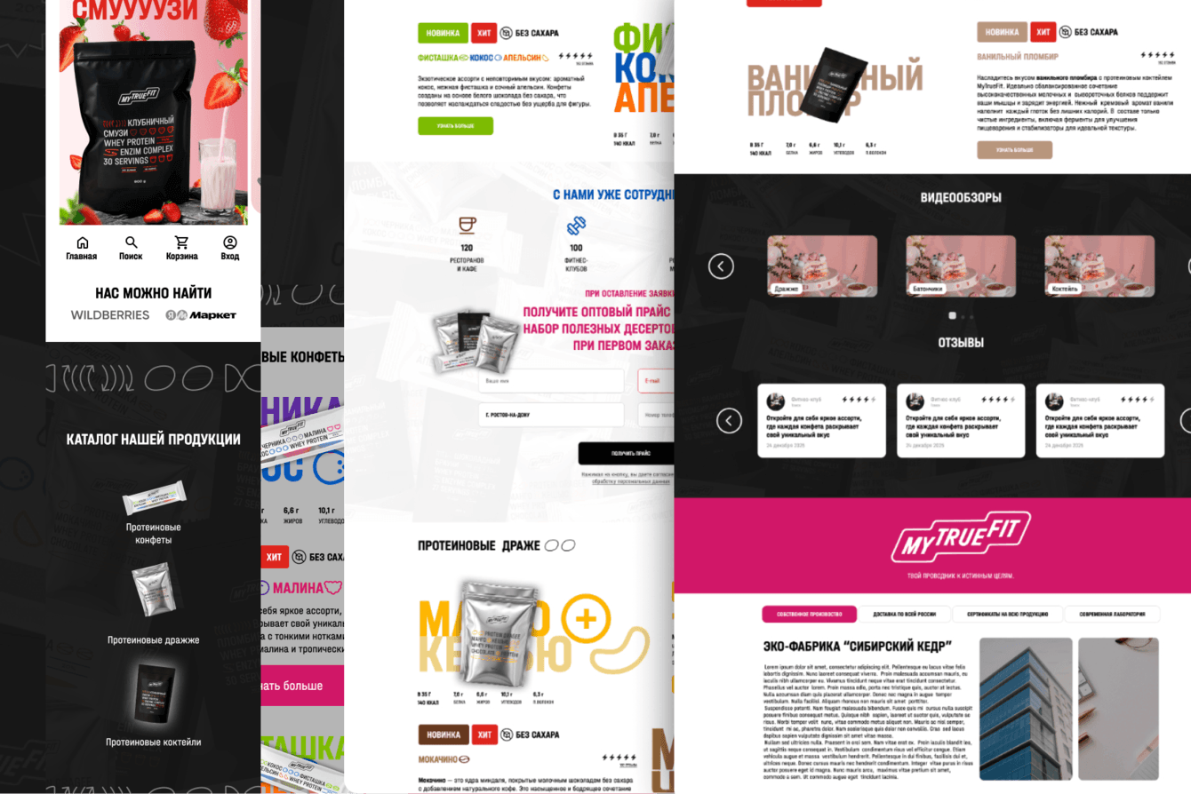 Наш постоянный партнёр — группа компаний «Сибирский Кедр» — обратилась к нам с очередным проектом в рамках договора комплексного обслуживания и развития. Требовалось разработать новый интернет-магазин для выводимого на рынок бренда спортивного питания «MyTrueFit». Клиент запросил создание более динамичного и современного проекта с акцентом на молодёжную аудиторию. Одним из ключевых условий стало стремление уйти от «однотипности» и «минималистичной серости» интернет-магазинов, представленных на рынке. Заказчик особо подчеркнул необходимость отхода от шаблонных решений и предоставил нам практически полную свободу творчества в рамках дизайн-концепции. Основная цель проекта была сформулирована как «создание устойчивого позитивного восприятия бренда через эффективную презентацию продукта и обеспечение возможности масштабирования без радикальной переработки концепции».