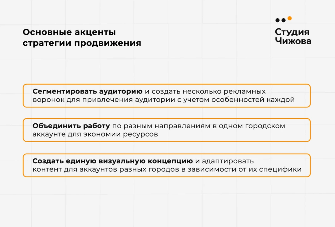 Таким образом, планируем и публикуем контент от общего — к частному. Сначала определяем публикации, которые будут актуальны для всех аккаунтов и потом добавляем в каждый аккаунт те, которые актуальны только для этого города.