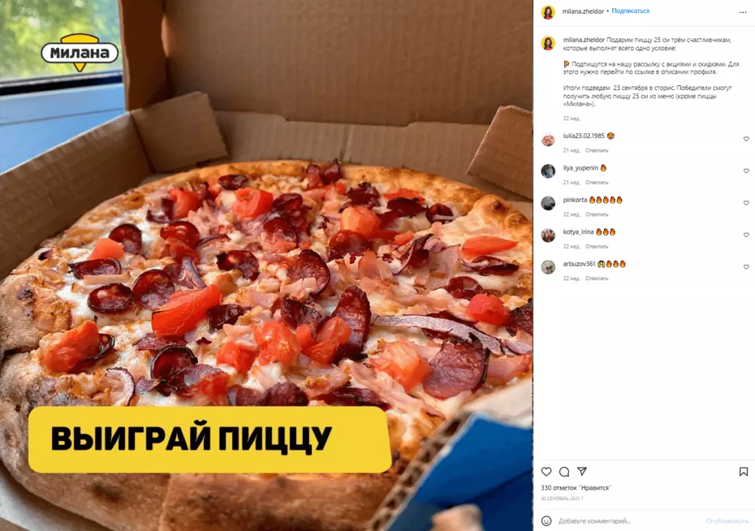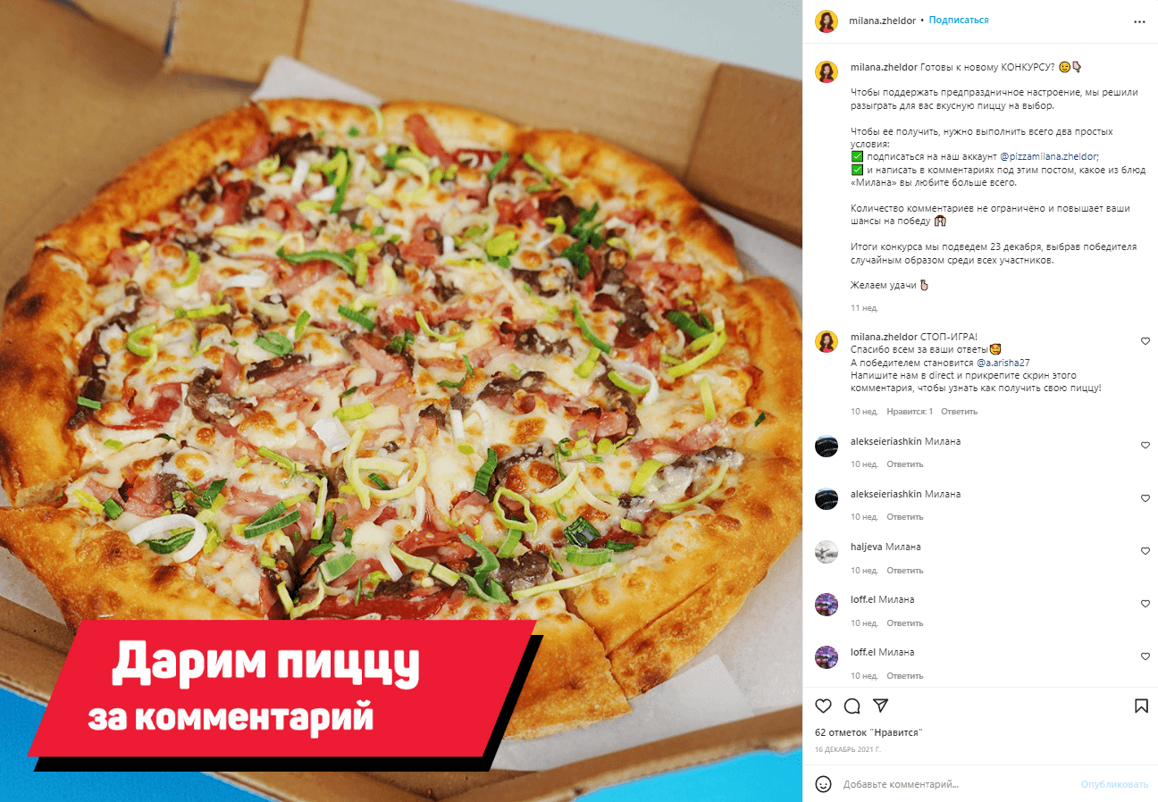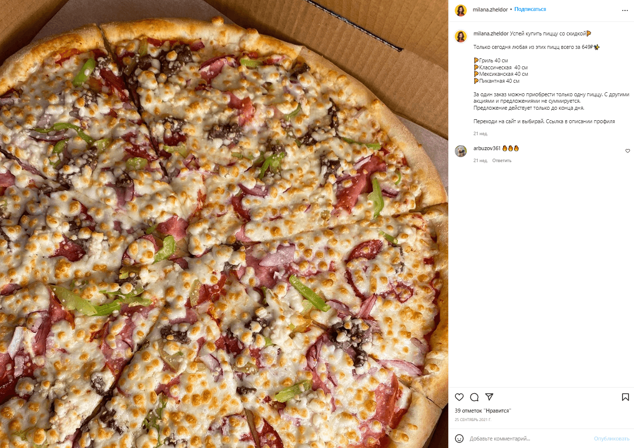 Чтобы привлечь как можно больше аудитории на старте. Сначала мы запустили конкурс на открытие, где дарили 50 пицц, чтобы привлечь аудиторию ещё до официального открытия, а уже после запустили акцию с 50% скидкой на пиццу в обеденные часы.
