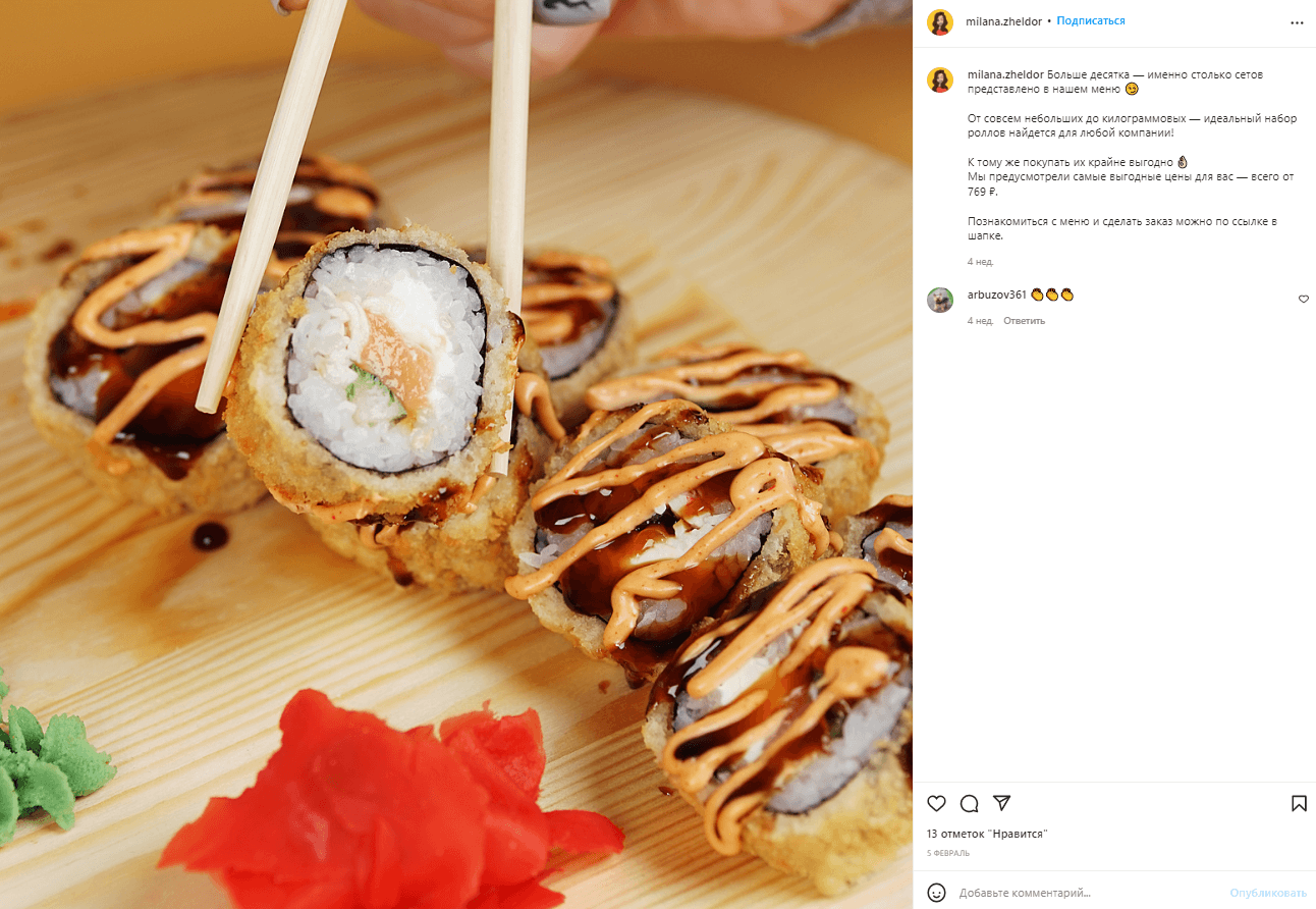Готовили отдельный контент для филиалов, у которых меню отличается от остальных. Например, сет Каролина был запущен только в Ногинске и Домодедово. Соответственно, мы рассказываем о нем в аккаунте этих городов, а для других планируем что-то другое. Проводили специальные акции для нового филиала