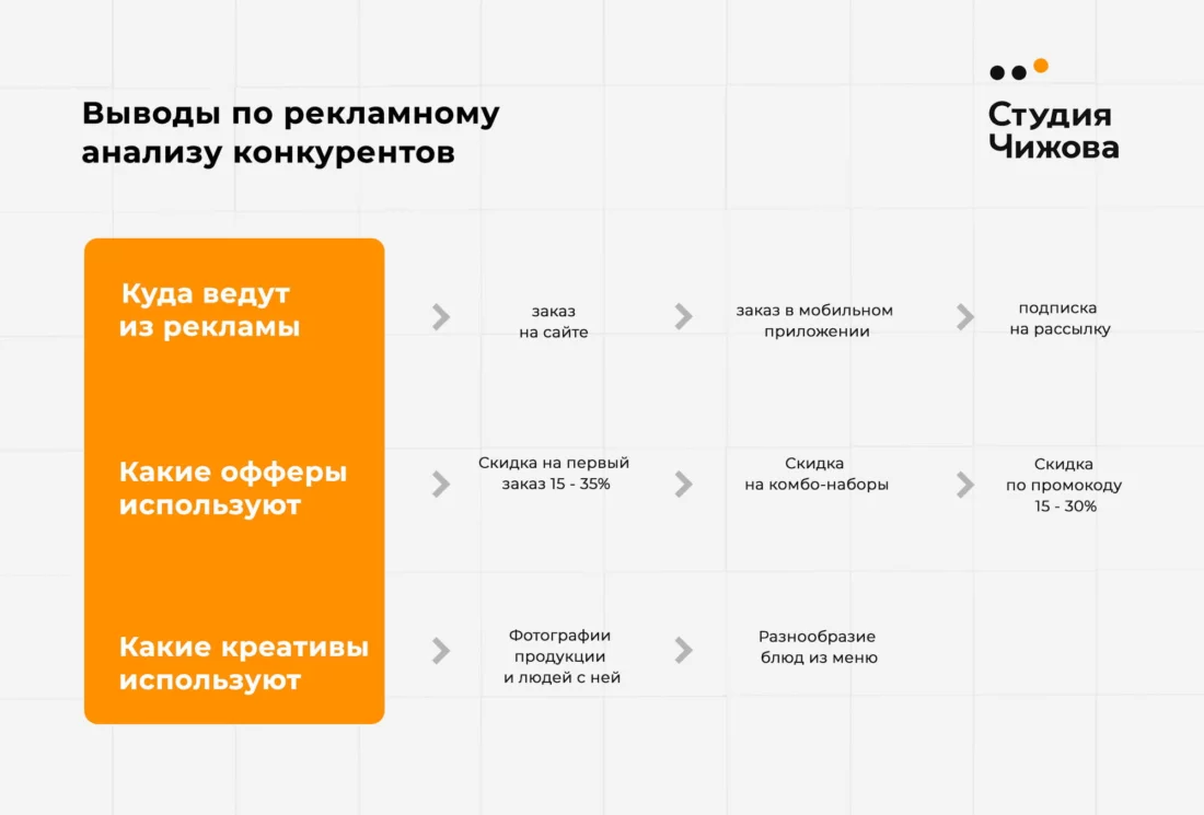 Прежде, чем приступать к разработке стратегии, мы изучили кейсы в нише доставке еды и сделали основные выводы по рынку.