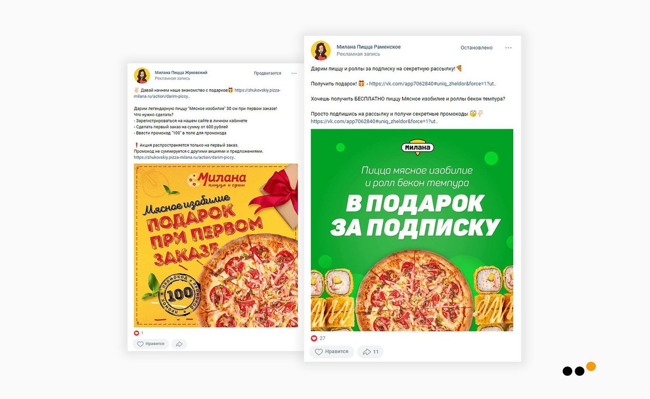 В контенте мы транслировали идею, что заказывать у нас выгодно, рассказывали об актуальных акциях и скидках. При этом ставили акцент на использовании качественных ингредиентов, доступных ценах, быстрой и аккуратной доставке, профессионализме поваров.