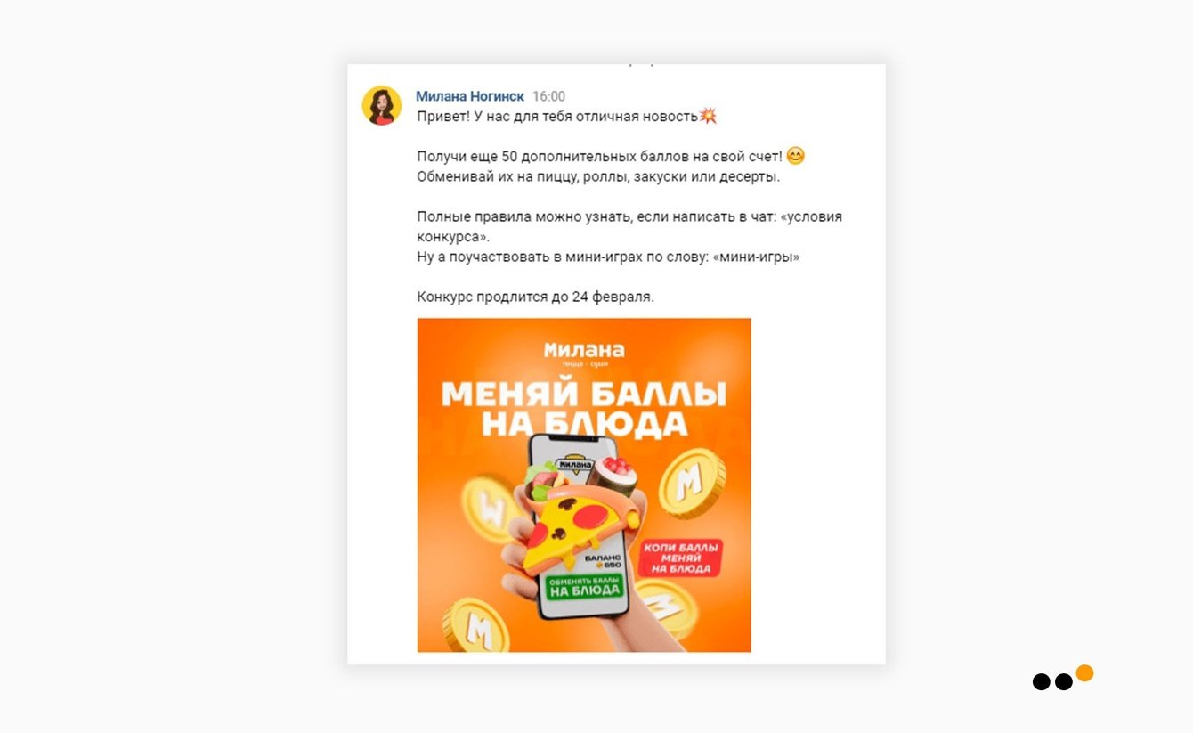 Чтобы стимулировать активность подписчиков, запустили конкурс активности, который позволял накопить баллы за лайки, комментарии, обсуждение и игры в чат-боте, а затем обменять их на блюда из меню.