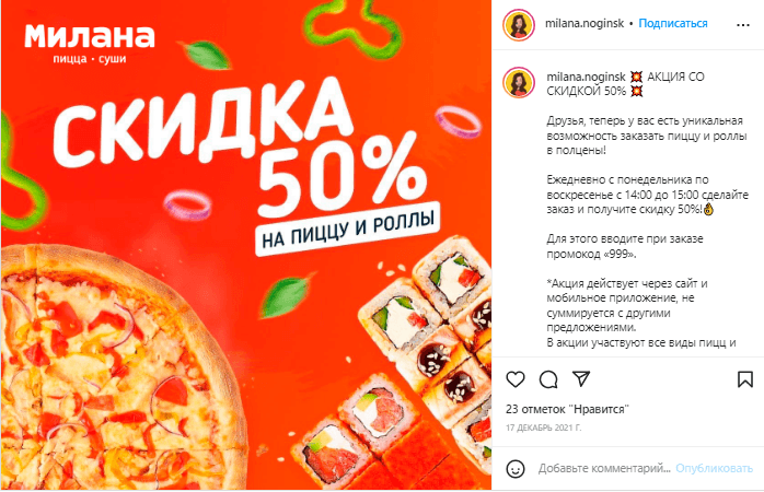 Специальная акция «Скидка 50% на пиццу и роллы», разработанная специально для запуска филиала в Ногинске, в других местах она не проводилась.
