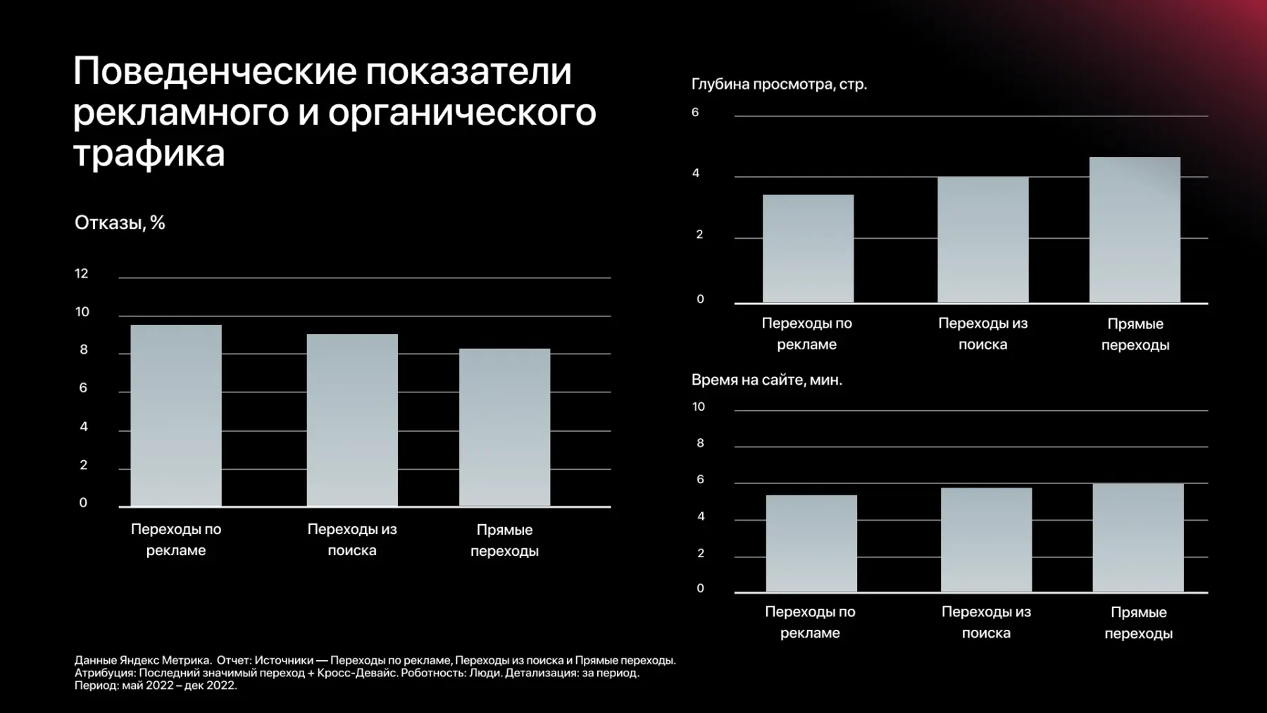 В 2022 году основным источником покупок (30%) и дохода (32%) на сайте среди всех каналов стала Яндекс Реклама. Поведенческие показатели рекламного трафика соответствуют условным нормам на сайтах в e-commerce (отказы менее 25%, время на сайте более 1 минуты и глубина просмотра более 3 страниц) и не уступают органическому трафику, что говорит о правильном подборе семантики и качестве трафика.