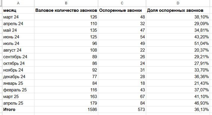 За 13 месяцев работы по одному из регионов мы оспорили 573 звонка (из общего количества 1586). А это целых 36,13 % !