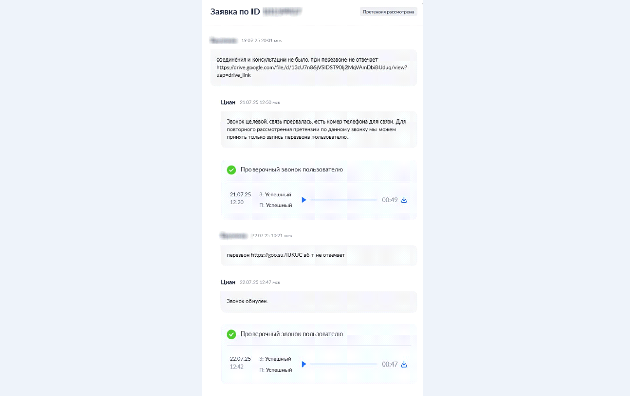Но не всегда бывает так просто и очевидно. Был еще один эпизод: не удалось дозвониться до абонента, человек не отвечал. Площадка отказывалась обнулять обращение, ссылаясь на то, что просто оборвалась связь с клиентом. Мы приложили запись контрольного повторного звонка, и после этого звонок все-таки был признан нецелевым.