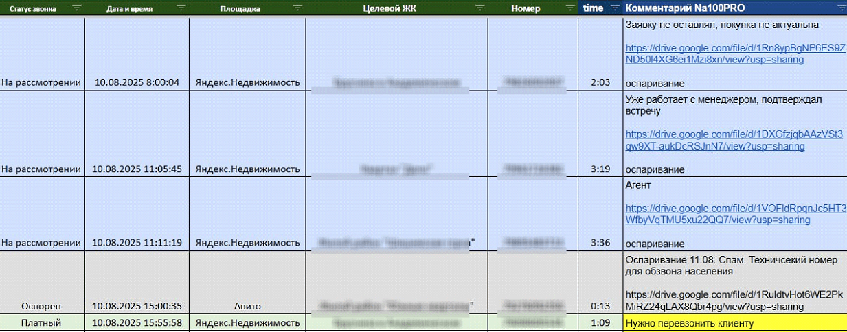 Разработали двухуровневую систему оценки звонков: учитывали критерии самой площадки, а также критерии застройщика. Сформировали таблицу, в которую вносили данные относительно соответствия звонков заявленным критериям и статусам. За счет этого мы смогли оспорить ряд звонков.