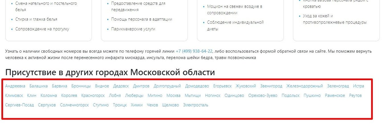 10) Реализован сложный функционал по генерация оптимизации страниц по городам Московской области, а также вывода пансионатов по районам для привлечения НЧ трафика. Впоследствии данный функционал стали копировать и внедрять у себя наши конкуренты. Суть данного функционала заключалась в том, чтобы охватить НЧ запросы по направлениям с упоминанием топонимов городов Московской области + привлечь целевой трафик именно с этих районов (самый горячий лид, как оказалось).