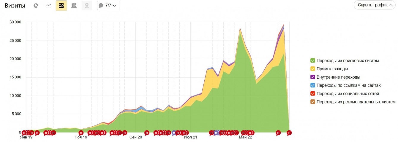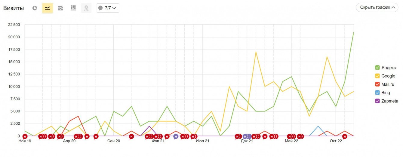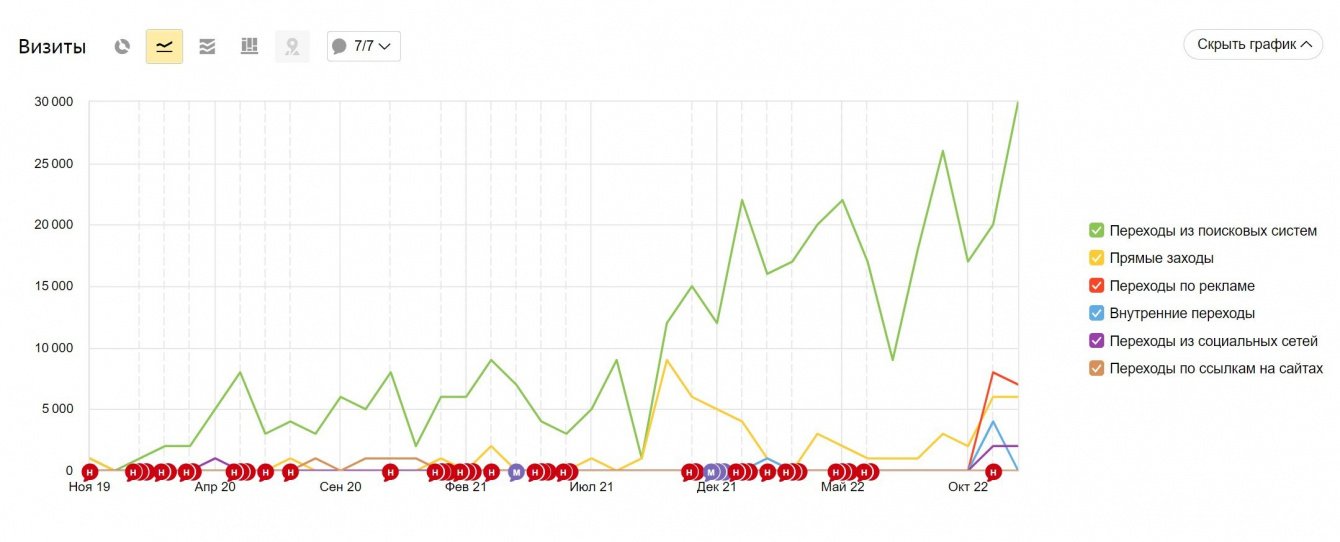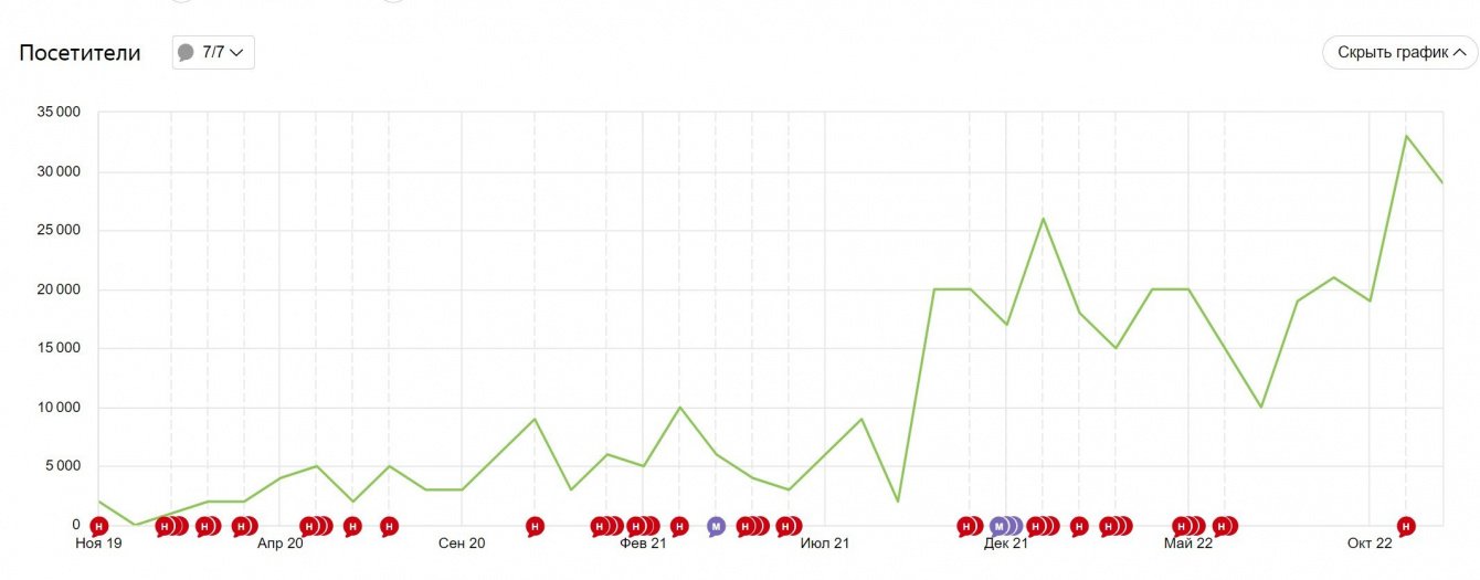 Благодаря работам над сайтом удалось увеличить трафик c 2000 в месяц (ноябрь 2019) до 33 000 (ноябрь 2022) +1550%!!!