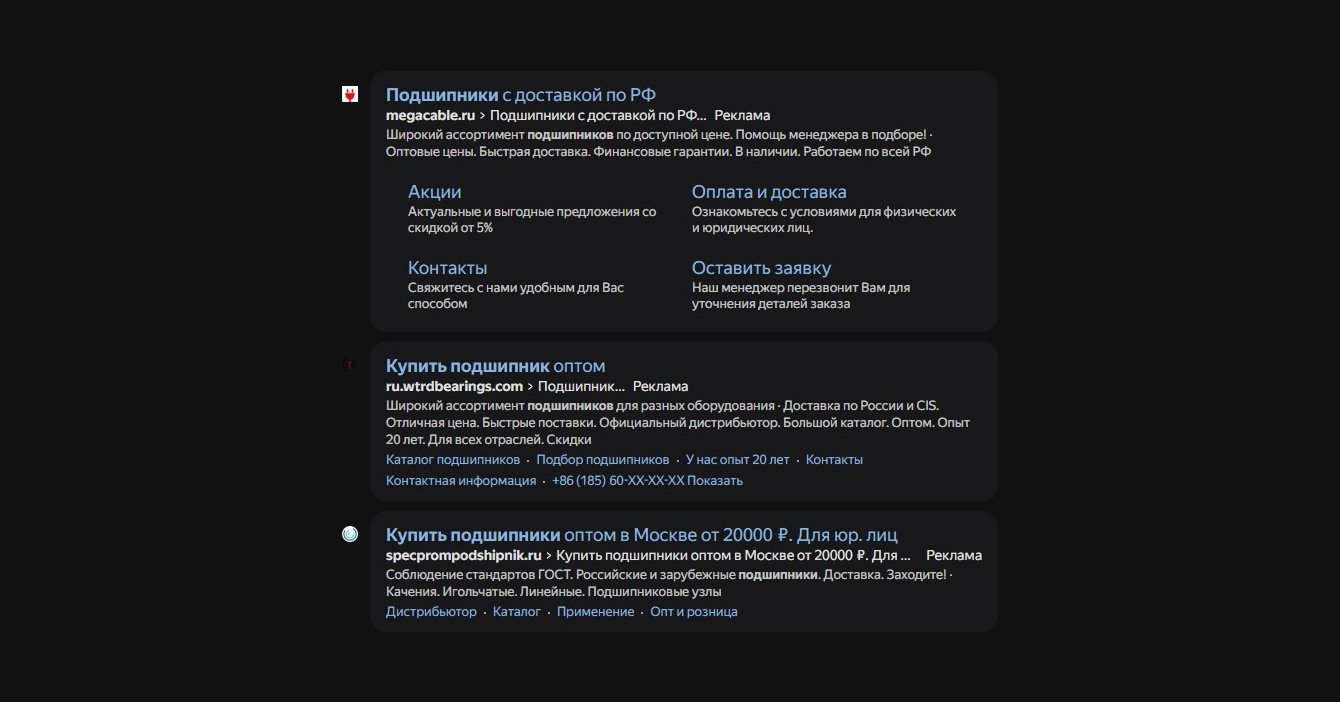 *Поисковая выдача по запросу «подшипники купить» по Нижнему Новгороду.
