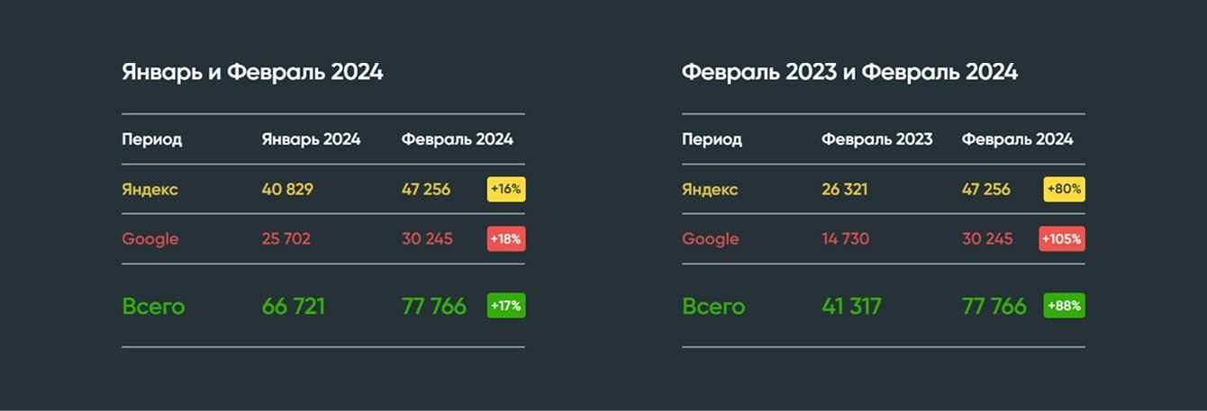 В январе 2024 получили прирост по трафику 61% по сравнению с январем 2023, в феврале — +88% по сравнению с прошлогодними показателями: