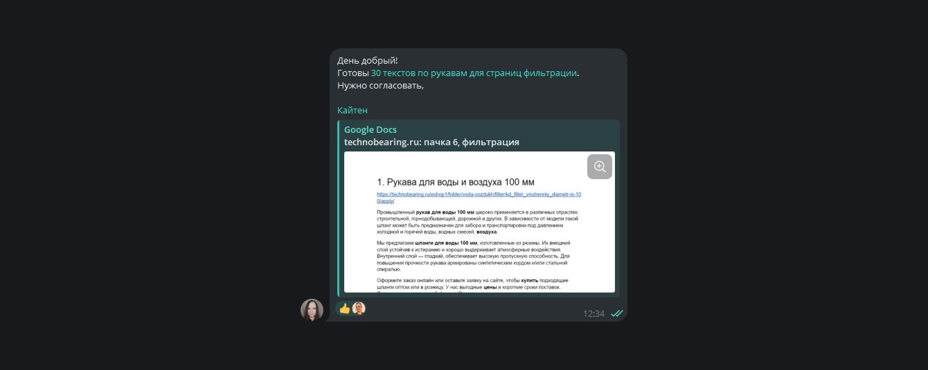 Выстроили эффективную коммуникацию. Создали чат в Telegram для команды УМа и сотрудников клиента, в который отправляли сообщения о выполненных работах, ссылки на файлы и карточки Kaiten. В этом же чате публиковали еженедельные постмиты — фиксировали договоренности после созвонов.