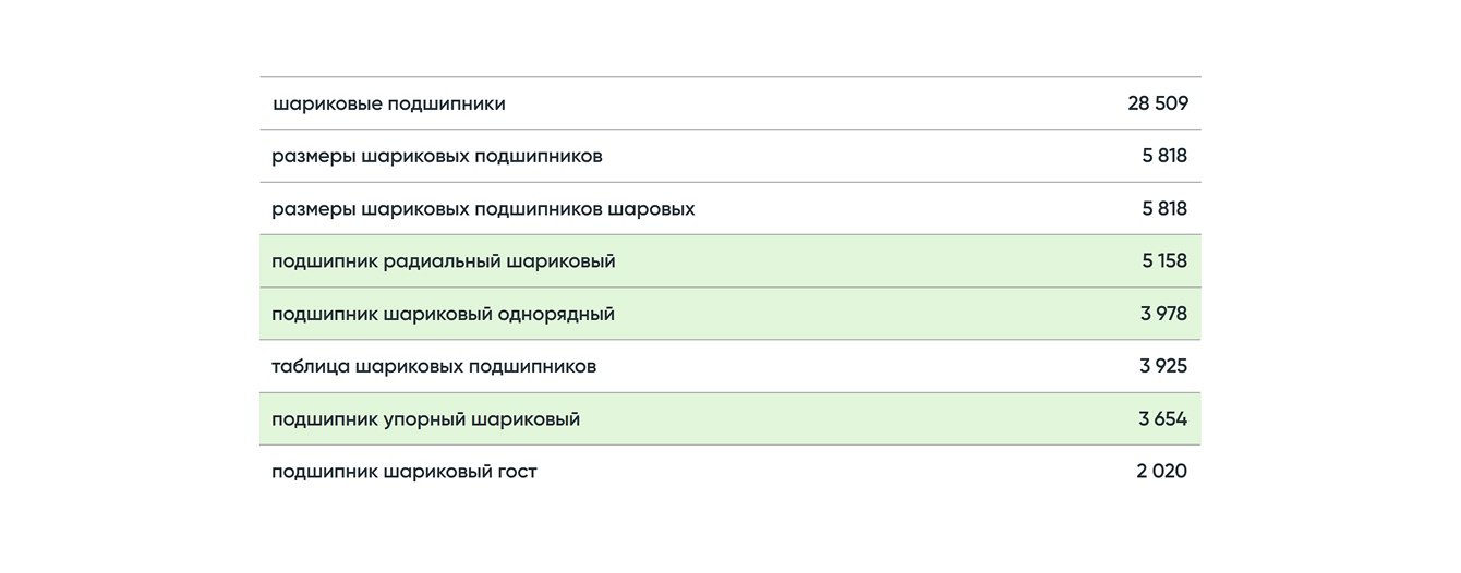 Ежемесячно собирали семантику по группам. Подбирали актуальные ключевые слова и фразы по разным категориям: подшипникам, втулкам, рейкам, камлокам и другим разделам каталога. Приоритеты для подбора определял клиент.