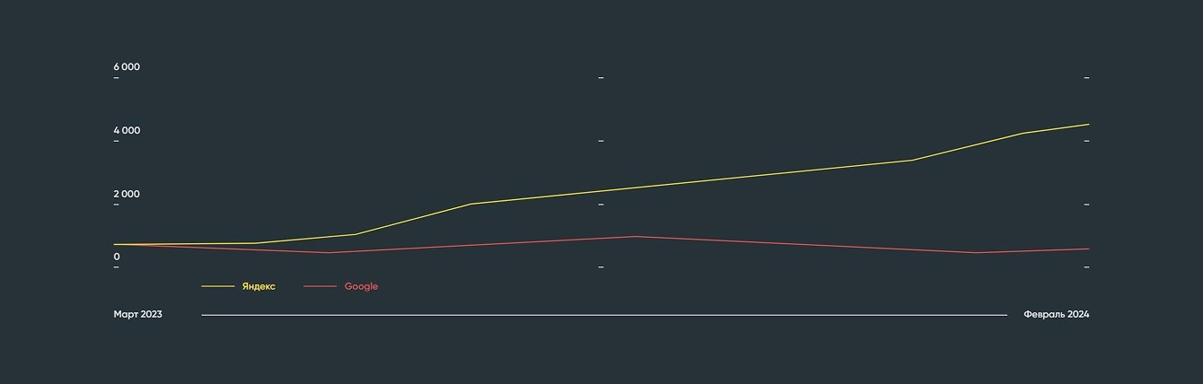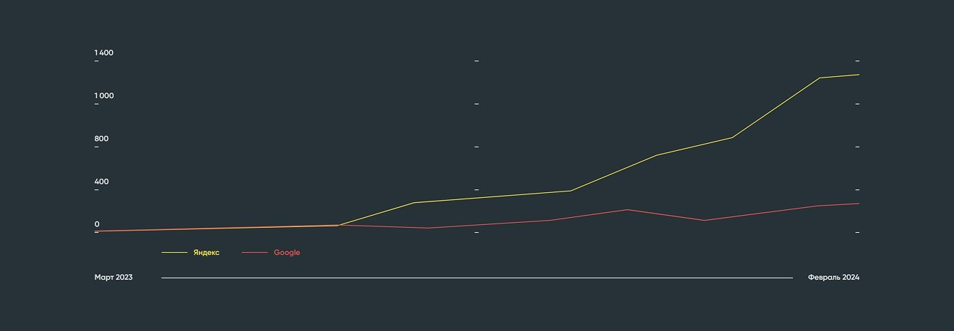 *Количество проиндексированных страниц с марта 2023 по февраль 2024.