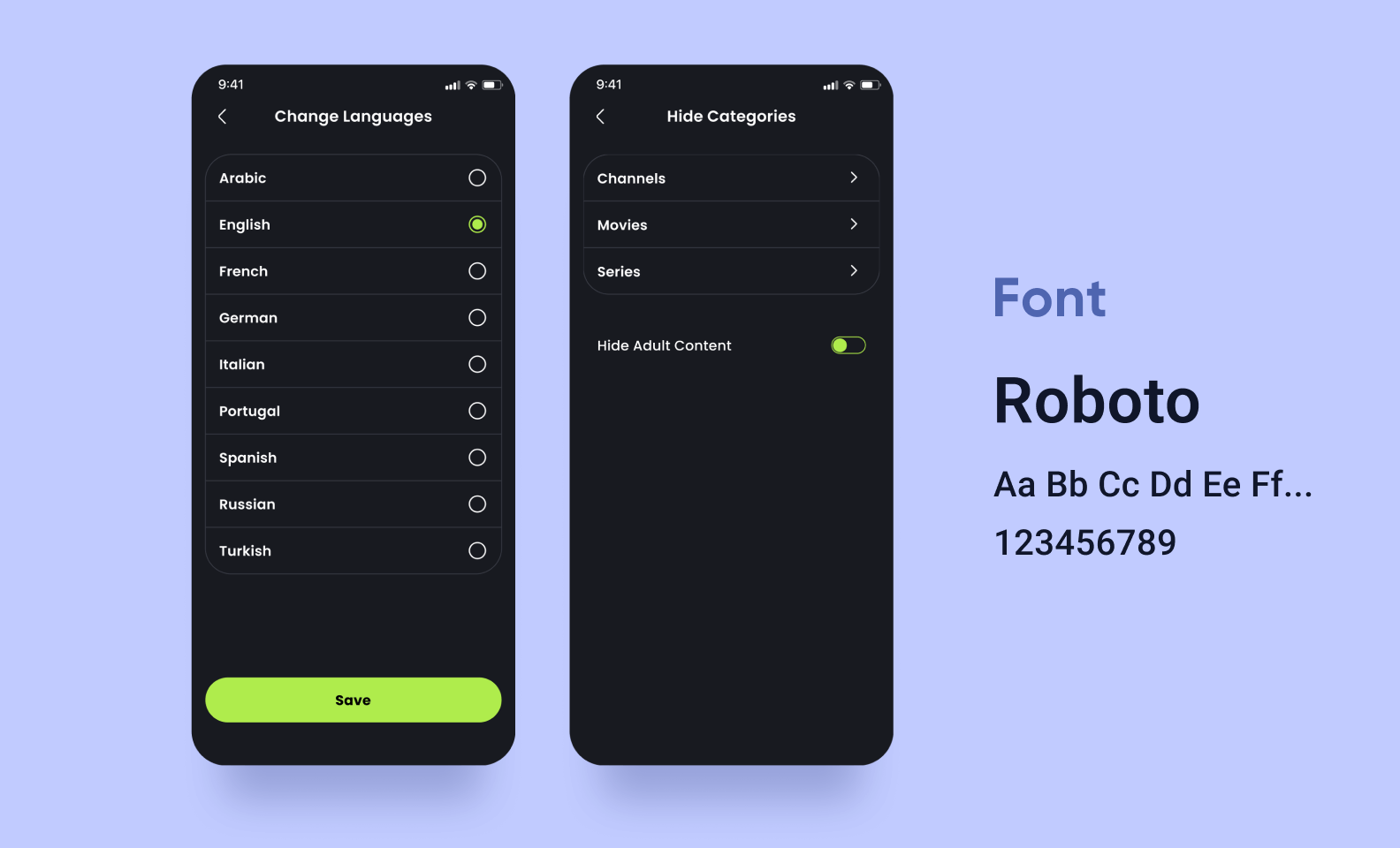 За основу мы взяли темную тему, чтобы пользователи чувствовали себя, как в кинотеатре — знакомой среде, где легко сосредоточиться на визуальном. Мы предложили клиентам две цветовые палитры на выбор: с акцентными фиолетовым и зеленым. Заказчики выбрали вторую.