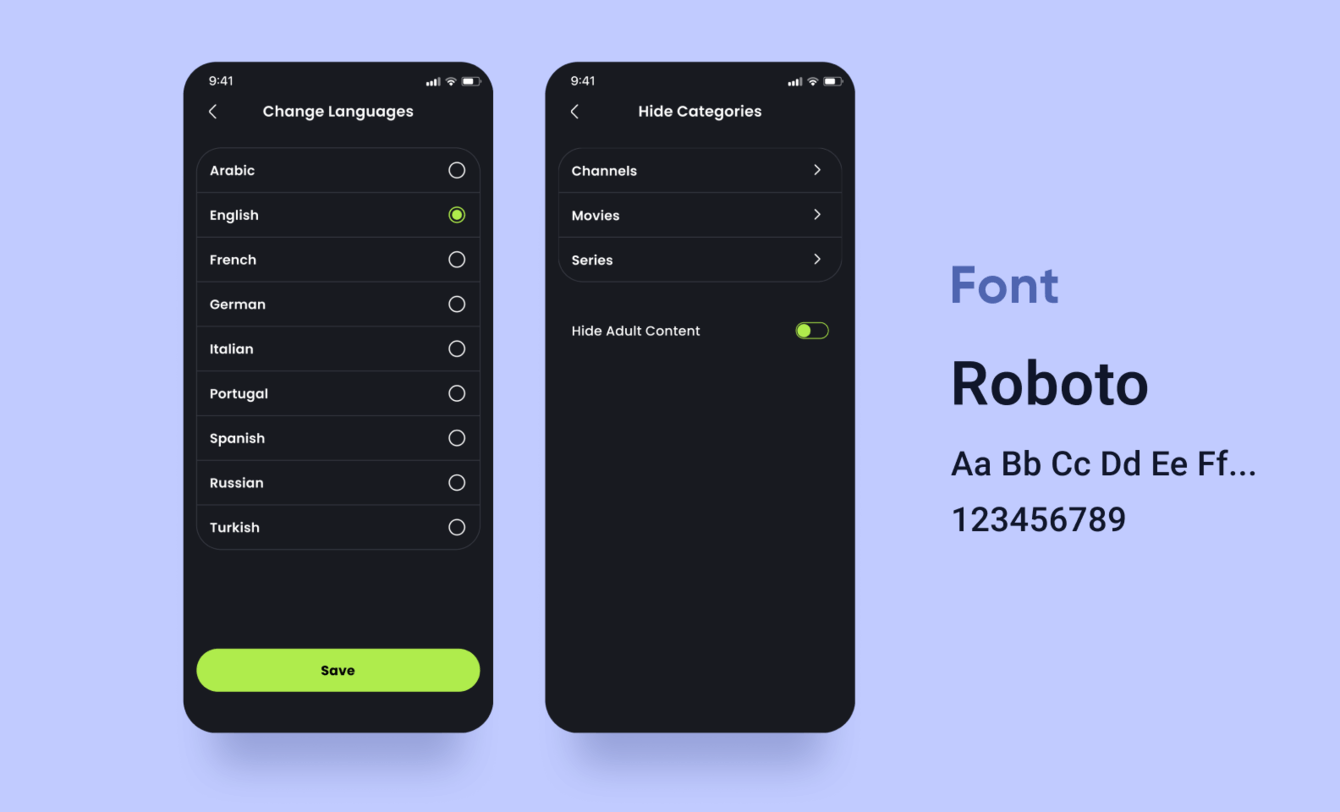 Шрифт — наш любимый Roboto. Максимально нейтральный и с большой вариативностью начертаний. С его помощью мы облегчили пользователям восприятие — тексты легко и быстро читаются, а все внимание зрителей остается у постеров. Еще мы сэкономили клиентам деньги — у Roboto бесплатная лицензия.