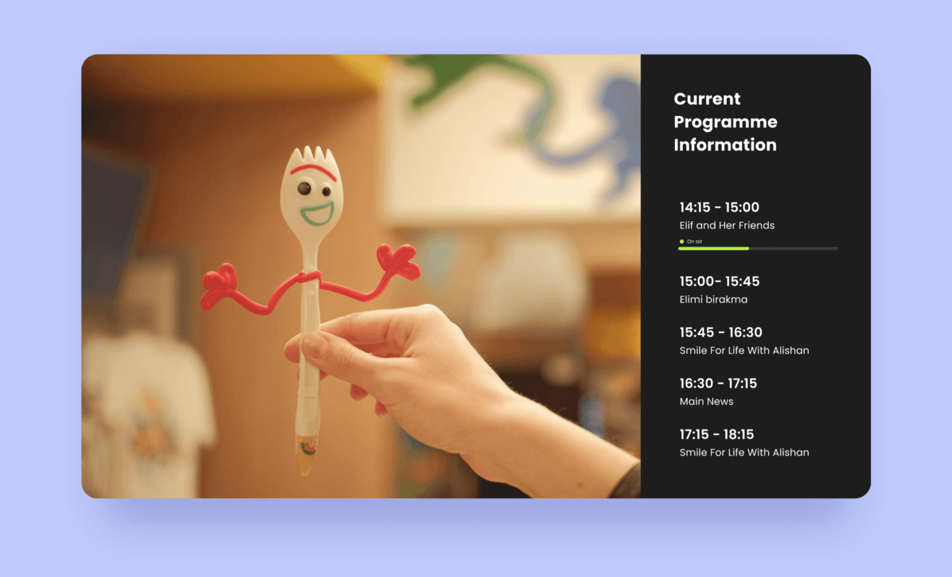 Чтобы сделать просмотр контента максимально удобным, мы интегрировали EPG — электронную программу телепередач. Во время просмотра ТВ-канала пользователи по клику видят информацию о том, что за шоу они смотрят, как долго оно будет идти и что следующее в программе.