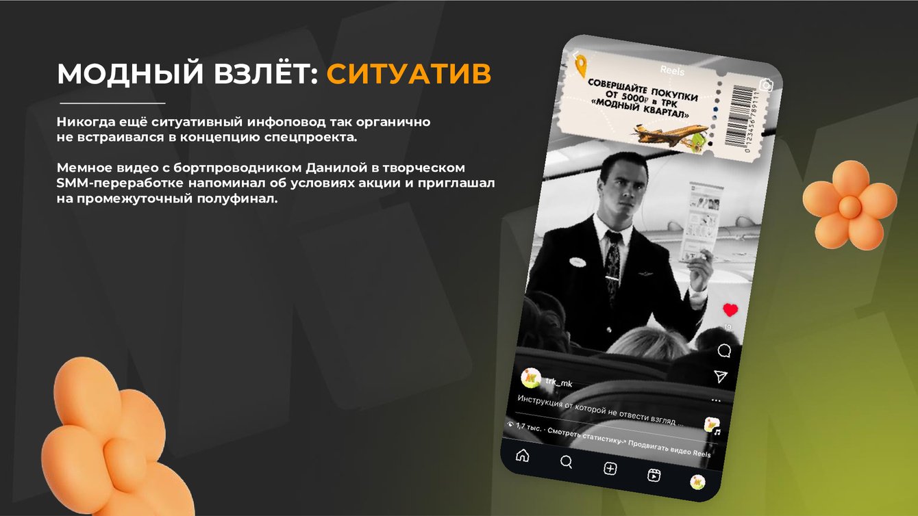 Делать SMM для ТРК «Модный Квартал» – сплошное удовольствие. За всё время работы нашего агентства над проектом соцсети торгового комплекса приросли почти на 7 тысяч подписчиков, и всё потому, что проект действительно стильный, современный, команда маркетинга без устали развивает его и устраивает лучшие мероприятия в городе. По реакциям на посты мы видим, что лояльность к ТРК очень высокая, и мы рады её усиливать через контент и SMM-механики.