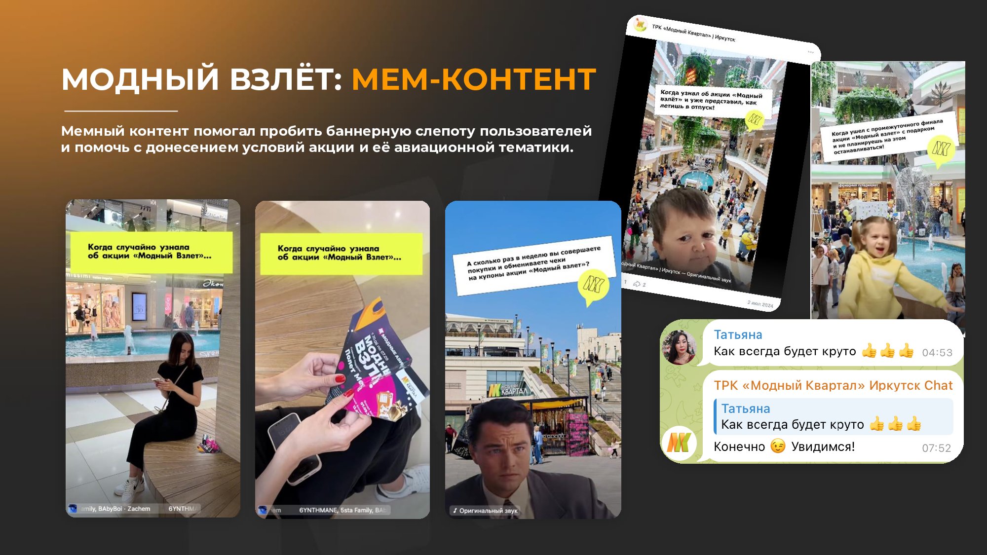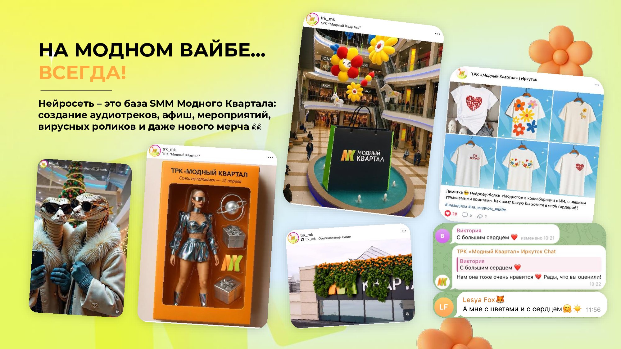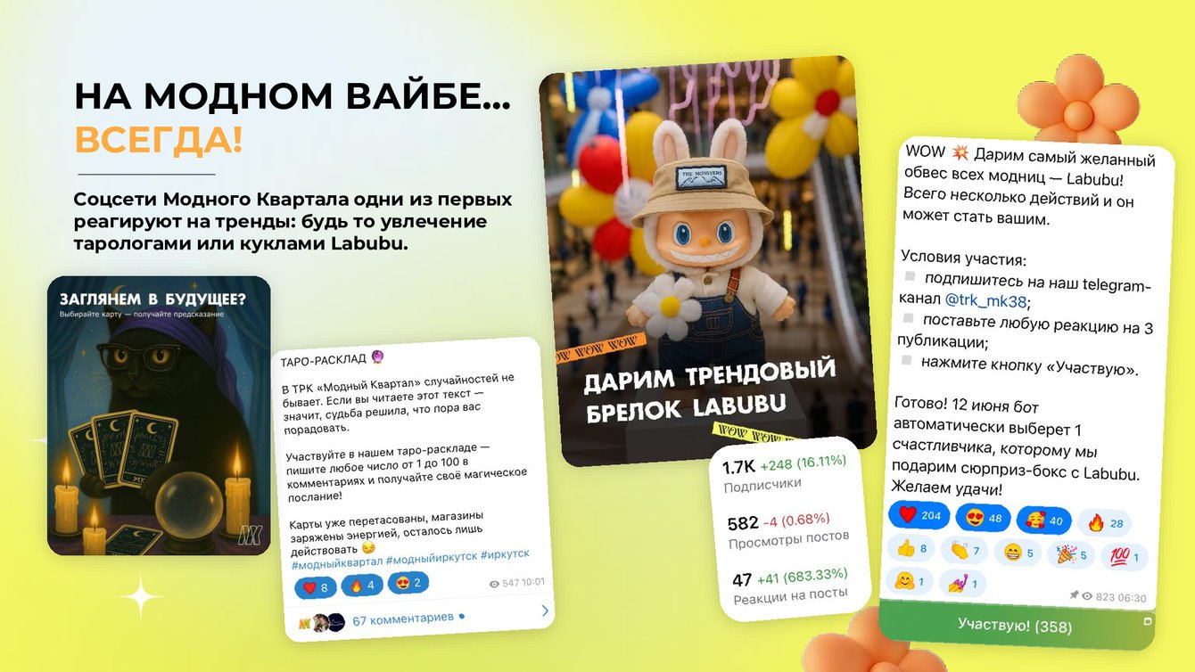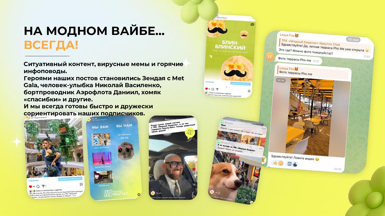 Раскрыть модный вайб торгового комплекса «Модный Квартал» через образы, рубрики, тональность текстов, выбор инфлюенсеров, трендовые мемы и горячие инфоповоды, и при этом поддерживать культурный код Сибири