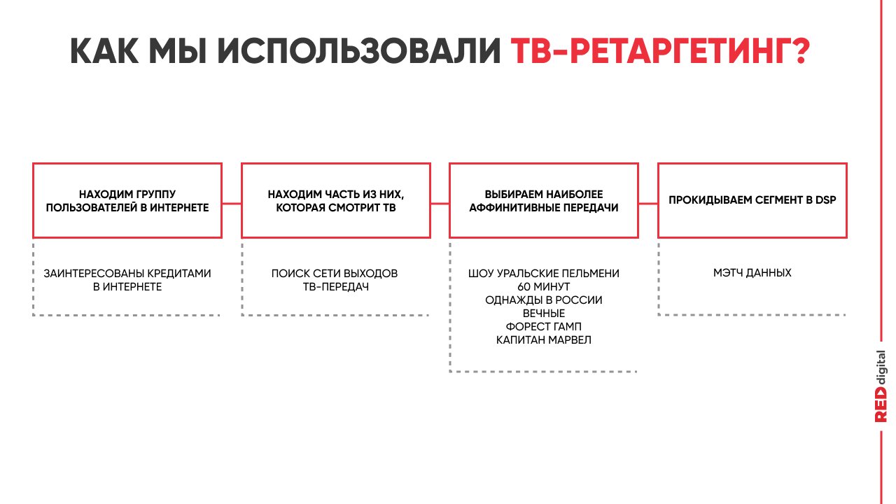 После согласования полученные данные о ТВ-аудитории пересекаются с аудиторными сегментами в интернете. В результате, агентство получило в распоряжение аудиторию, заинтересованную в кредите наличными, для показа ей соответствующих креативов.