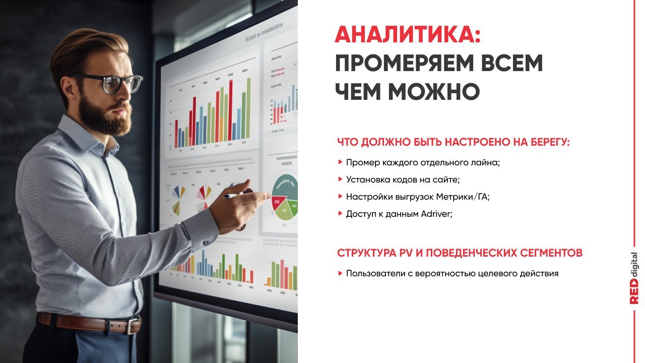 Практика показывает, что кампания не достигнет целей, если до её запуска не будет настроена качественная аналитика. Сюда входит промер каждого отдельного лайна и установка кодов на сайте: это позволяет видеть цифры по каждому каналу и оптимизировать отдельно и точечно лайны кампании.
