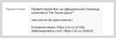 Основная цель рекламы — переходы по ссылке в личные сообщения группы. Там пользователя встречало приветственное сообщение, после которого он мог задать интересующие вопросы или сразу забронировать столик.