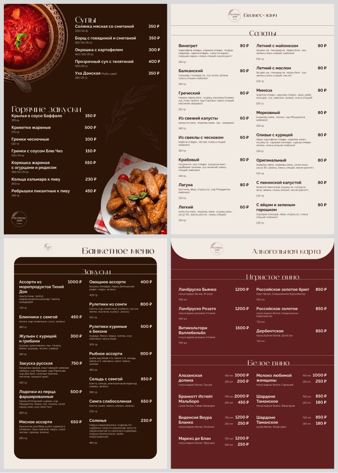 — Разработали дизайн меню для ресторана: бизнес-ланч, фуршет, банкетное меню, винная карта.