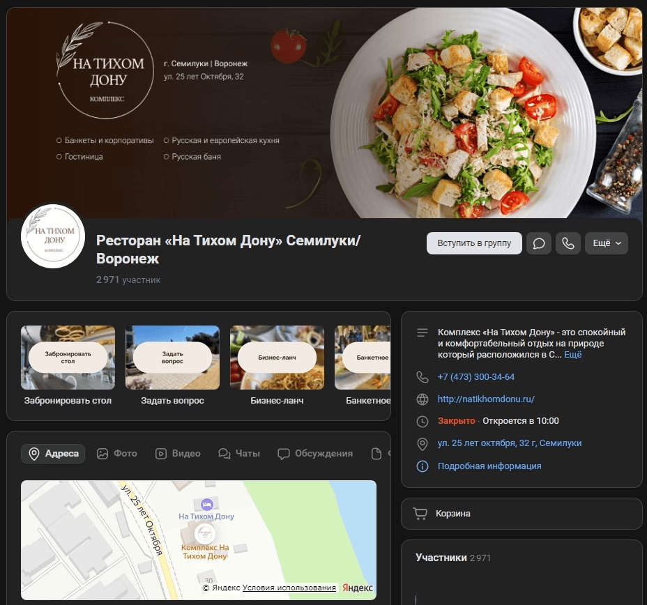 1. Оформили сообщество в VK: обновили дизайн, добавили кнопки меню, виджеты для услуг, разработали бизнес-ланч и банкетное меню.