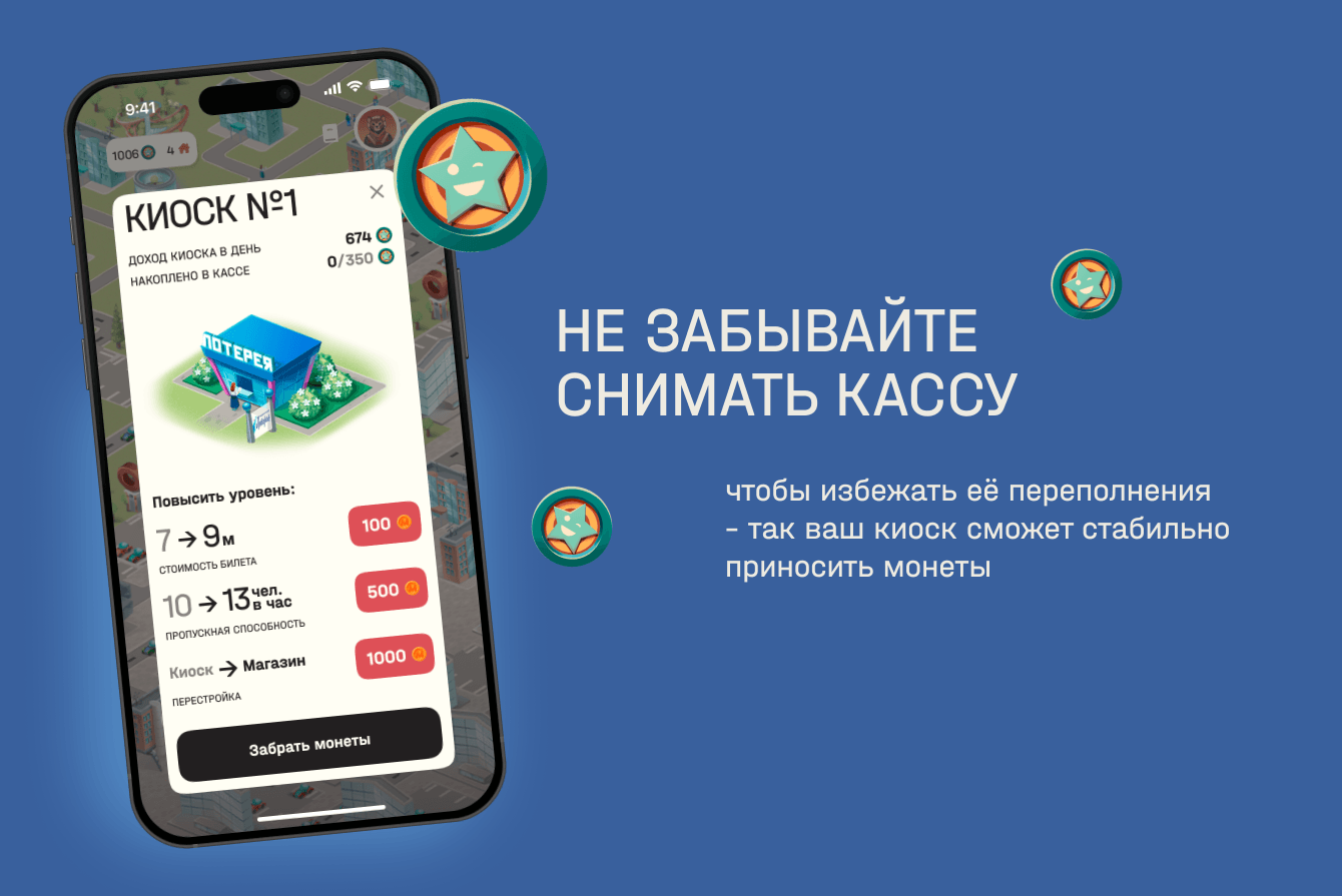 Получайте монеты, которые вы можете потратить на повышение уровня киоска, увеличение ее доходности или постройку новой точки.