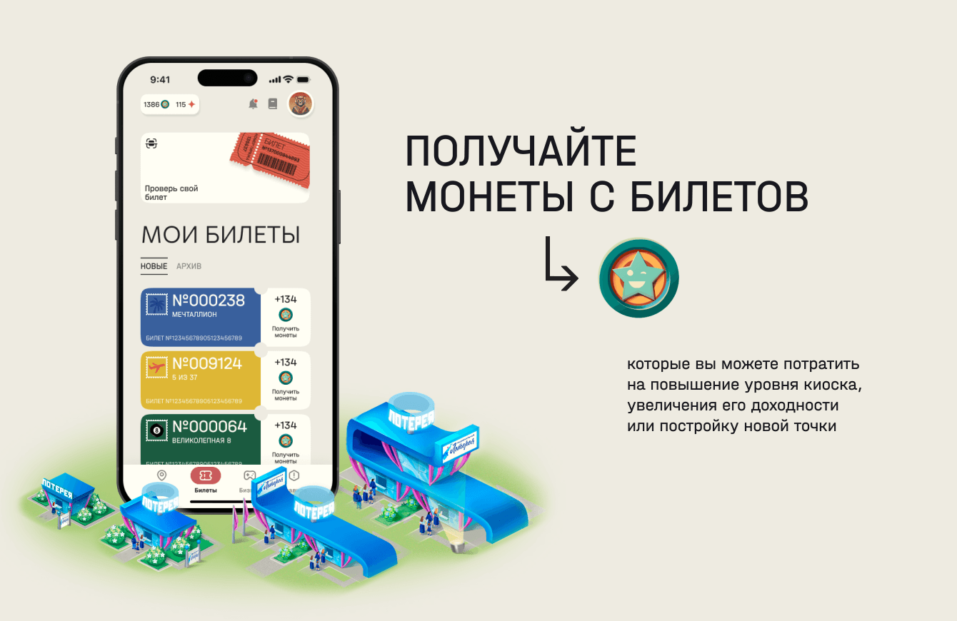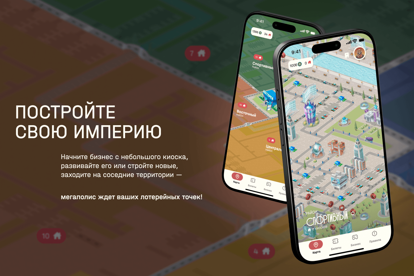 Постройте свою империю. Начните бизнес с небольшого киоска, развивайте его или стройте новые, заходите на соседние территории — мегаполис ждет ваших лотерейных точек.