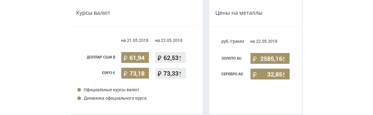 Также на главной странице можно посмотреть курсы валют и цены на металлы